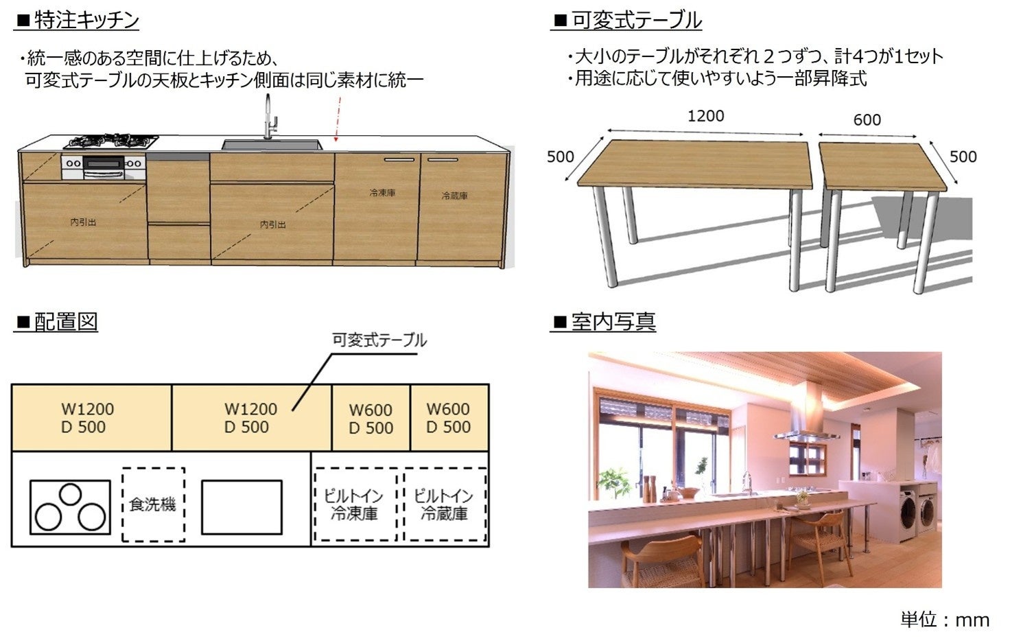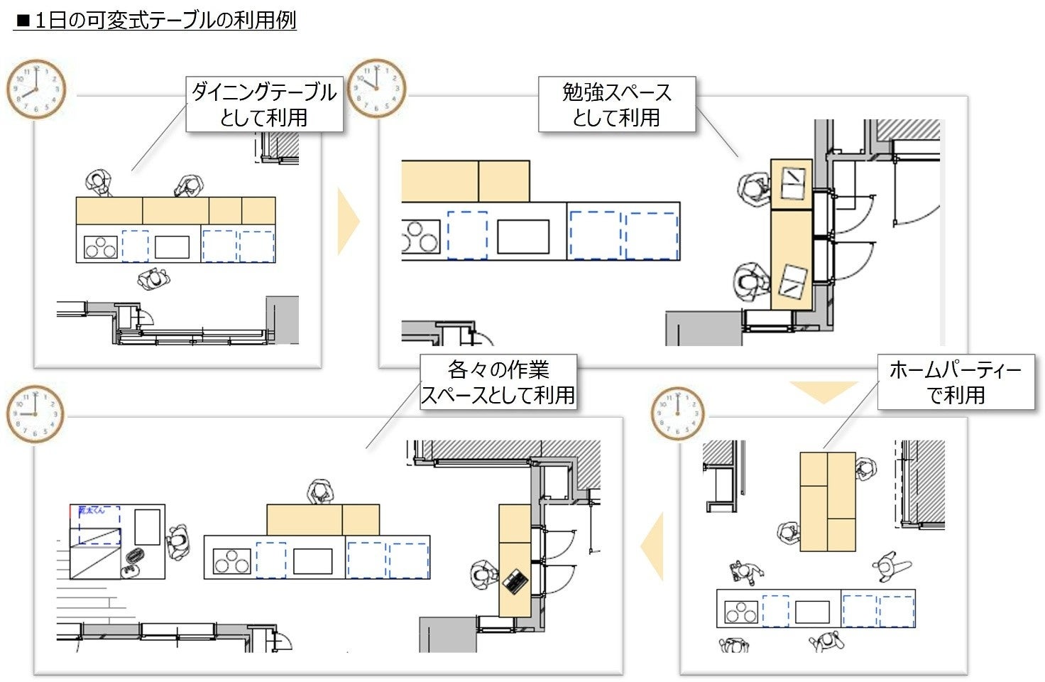 ①「可変式テーブルユニット」による、“家族との時間”と“自分時間”が調和するLDK