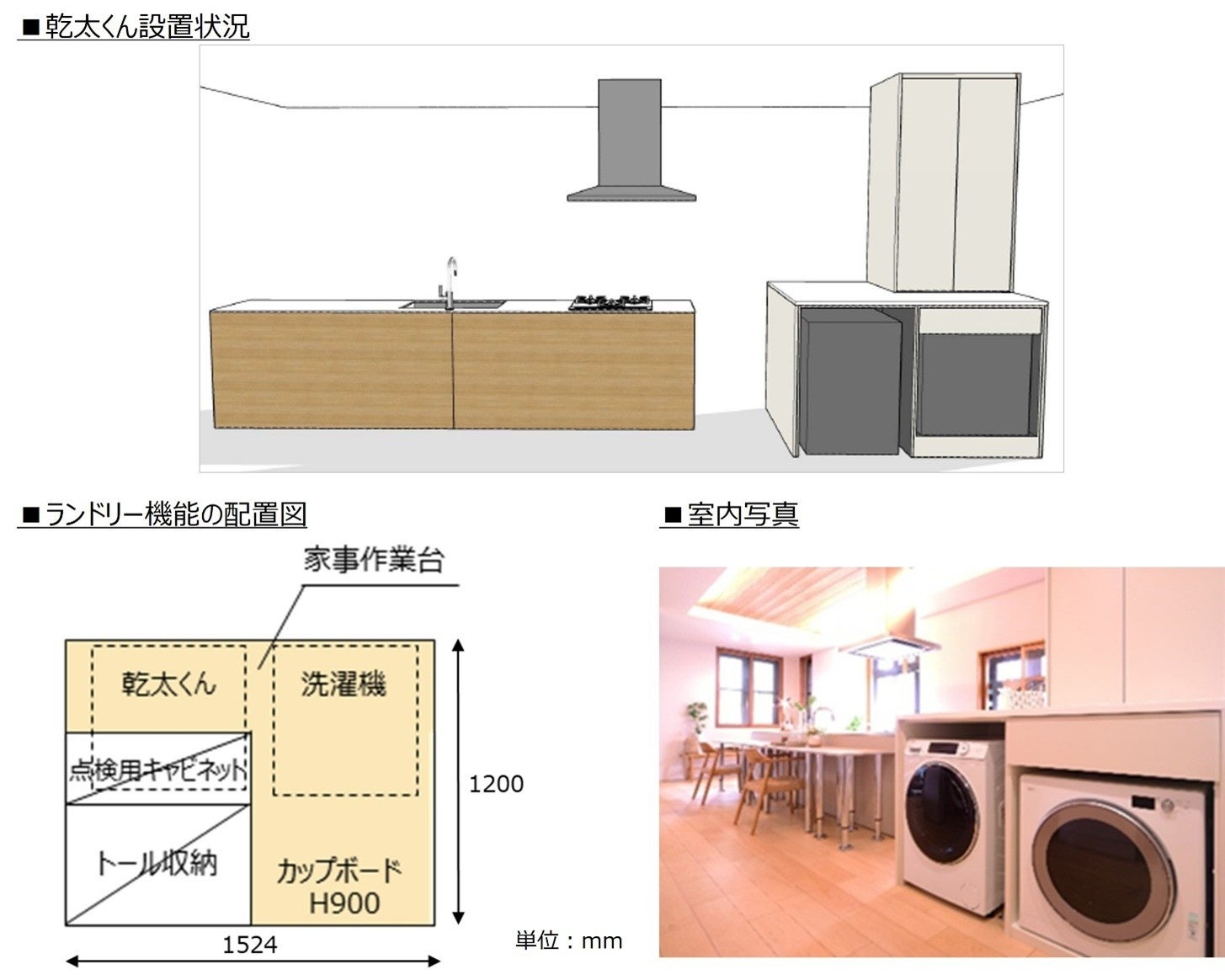 能性を探ります。また、ランドリー機能(洗濯機と「乾太くん」)をキッチンと横並びで配置し、家事動線に配慮したLDK空間を考案しました。