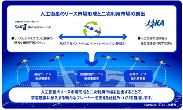 SMFLみらいパートナーズとJAXAは、SMFLみらいパートナーズが持つリースビジネスで培った物件の所有や価値を評価するノウハウと、JAXAが持つ人工衛星の信頼性や健全性評価に関する技術を組み合わせることで、人工衛星のリース市場の形成と二次利用市場の創出に向けた事業コンセプトを共創します。