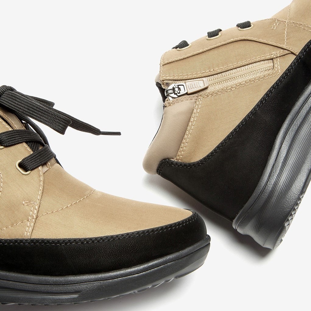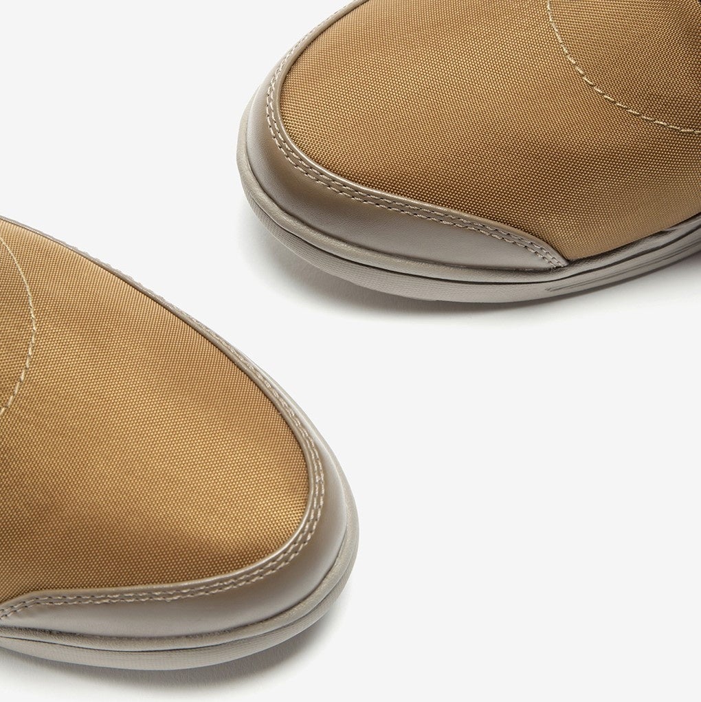トレンドのアウトドアやミリタリーを感じさせる雰囲気ですが、細見えのフォルムとやわらかなシルエットがフェミニンな印象なので、普段のお洋服にすっと馴染みやすい晴雨兼用スニーカーブーツです。