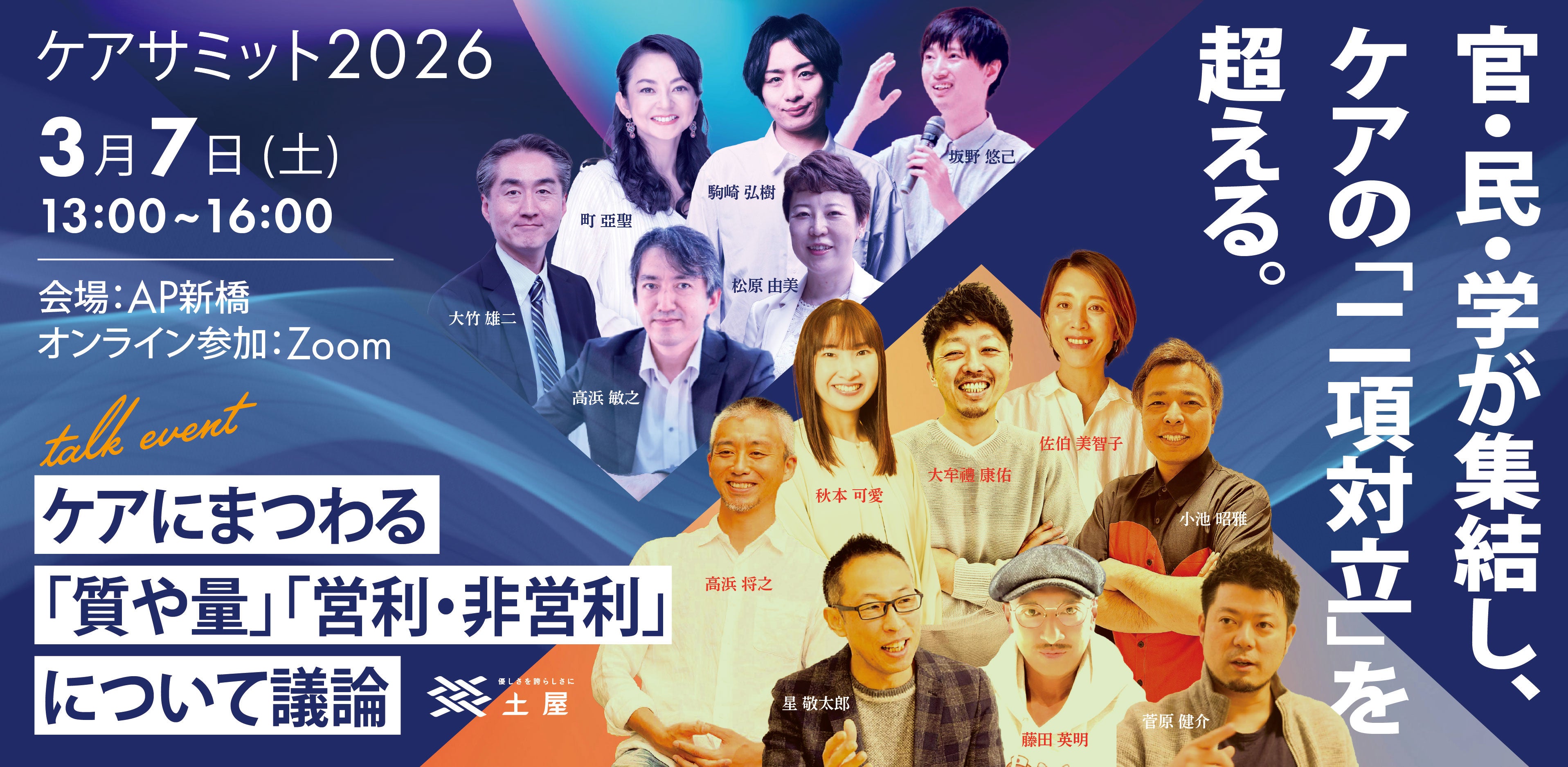 介護のトータルケアカンパニーとして全国47都道府県で障害をお持ちの方や高齢者に介護サービスを提供する株式会社土屋(本社:岡山県井原市、代表取締役:高浜敏之、以下「土屋」)は、2026年3月7日(土)にAP新橋およびオンラインにて『ケアサミット2026―立場を超え“利用者のための共創”を実現するには ―』を開催いたします。