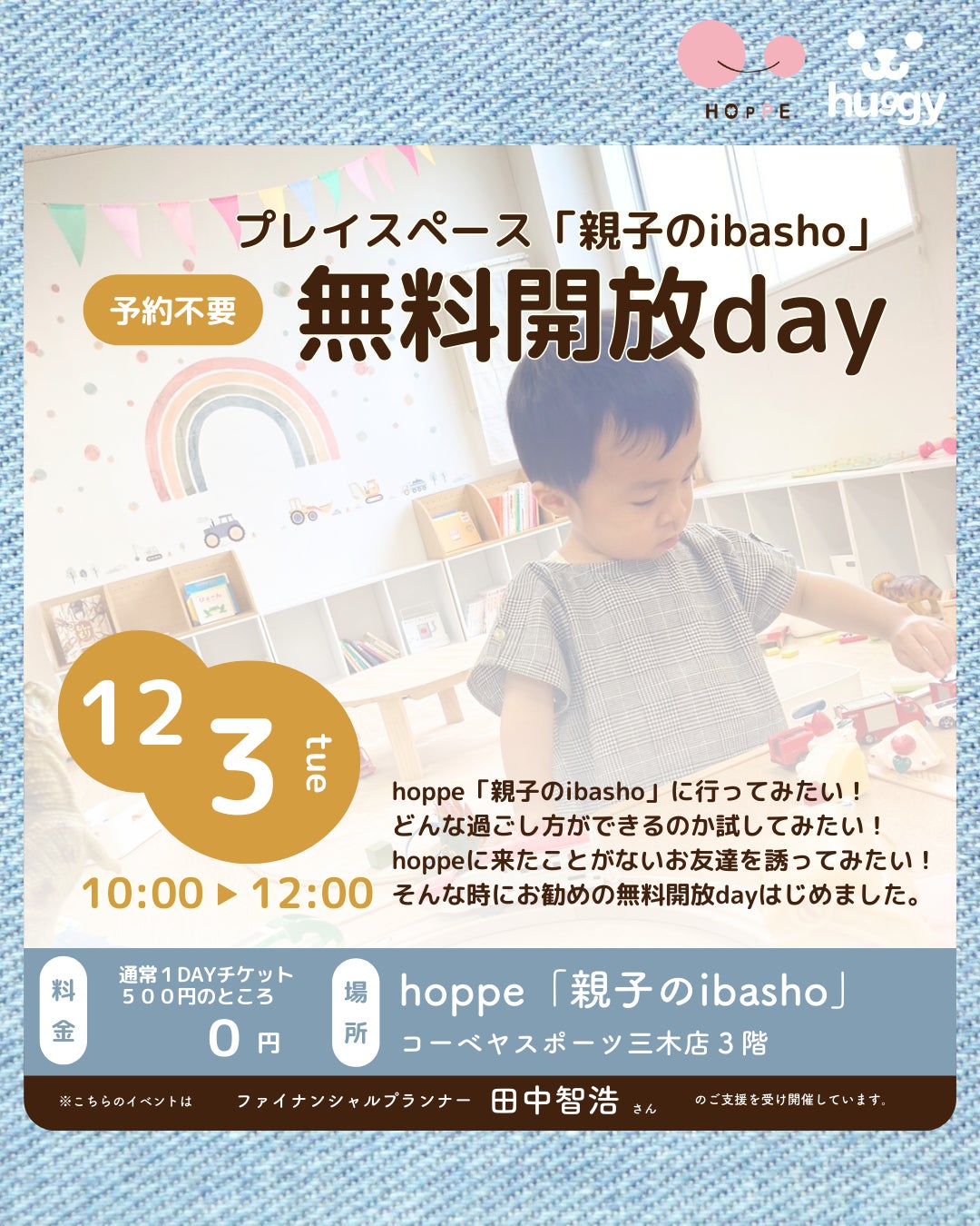 特定非営利活動法人ほっぺ(代表:大森奈津子・兵庫県三木市)は、2024年12月3日(火)、乳幼児親子のプレイスペースhoppe「親子のibasho」(コーベヤスポーツ三木店3階)を『無料開放day』とします。hoppe「親子のibasho」に行ってみたい!どんな過ごし方ができるのか試してみたい!hoppeに来たことがないお友達を誘ってみたい!そんな時におすすめできるのが『無料開放day』です。