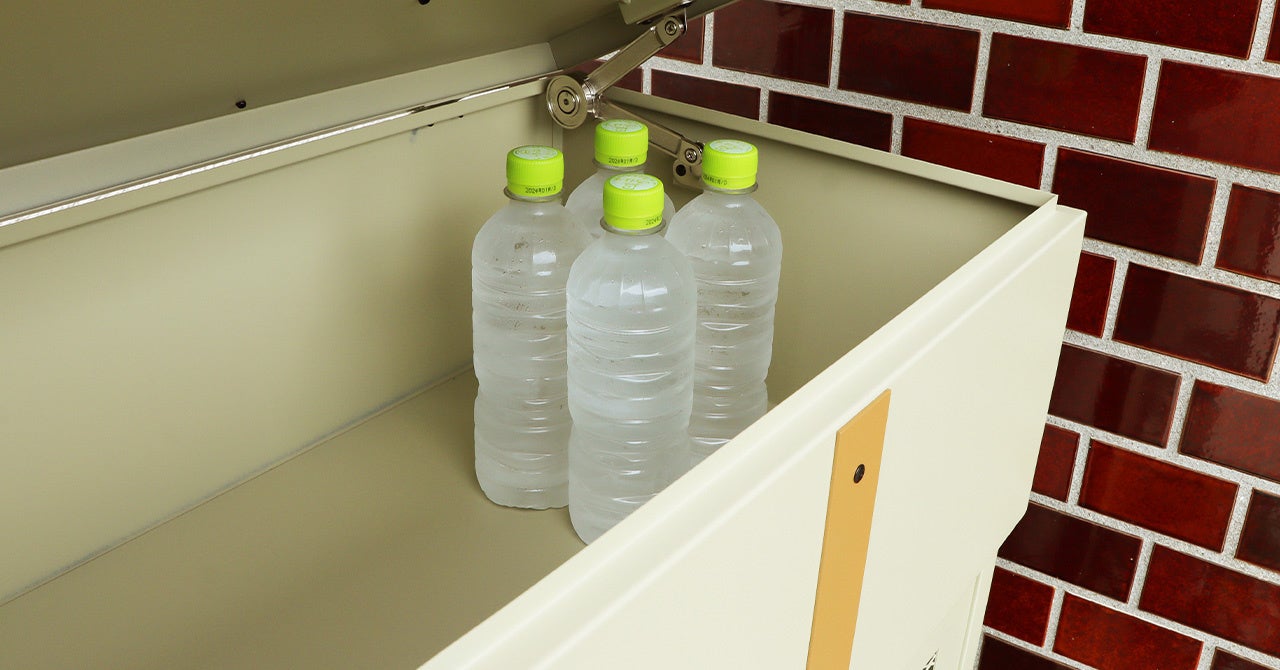 収納BOXは、上段BOXは、500mlペットボトル60本を収納することができるほどの大容量で、備蓄場所としても役立ちます。その他、ガーデニンググッズや、災害時に役立つ防災グッズなどの保管場所としてもおすすめです。