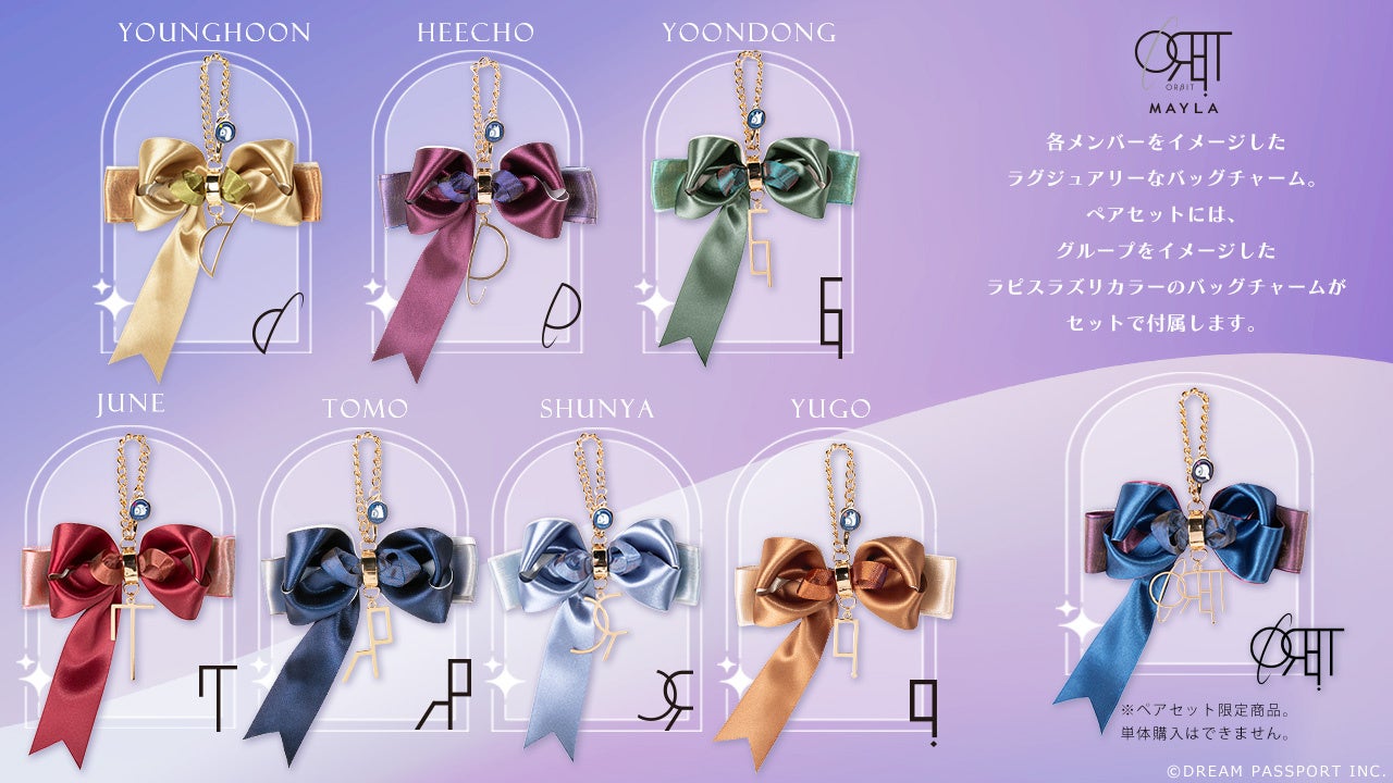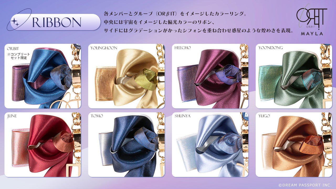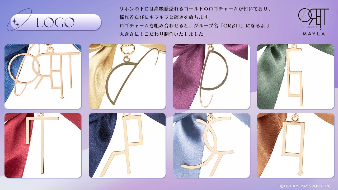 リボンの下には高級感溢れるゴールドのロゴチャームが付いており、揺れるたびにキラキラと輝きを放ちます。ロゴチャームを組み合わせると、グループ名『ORβIT』になるよう大きさにもこだわり制作いたしました。