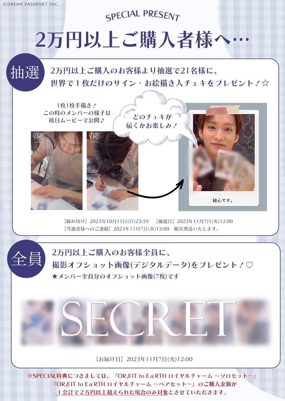 【豪華ペアセット内容:ロイヤルチャーム1点+グループロイヤルチャーム1点(★)+メインビジュアルカード1枚+セルカカード1枚(★)+全員集合のメッセージつきポストカード(★)】
