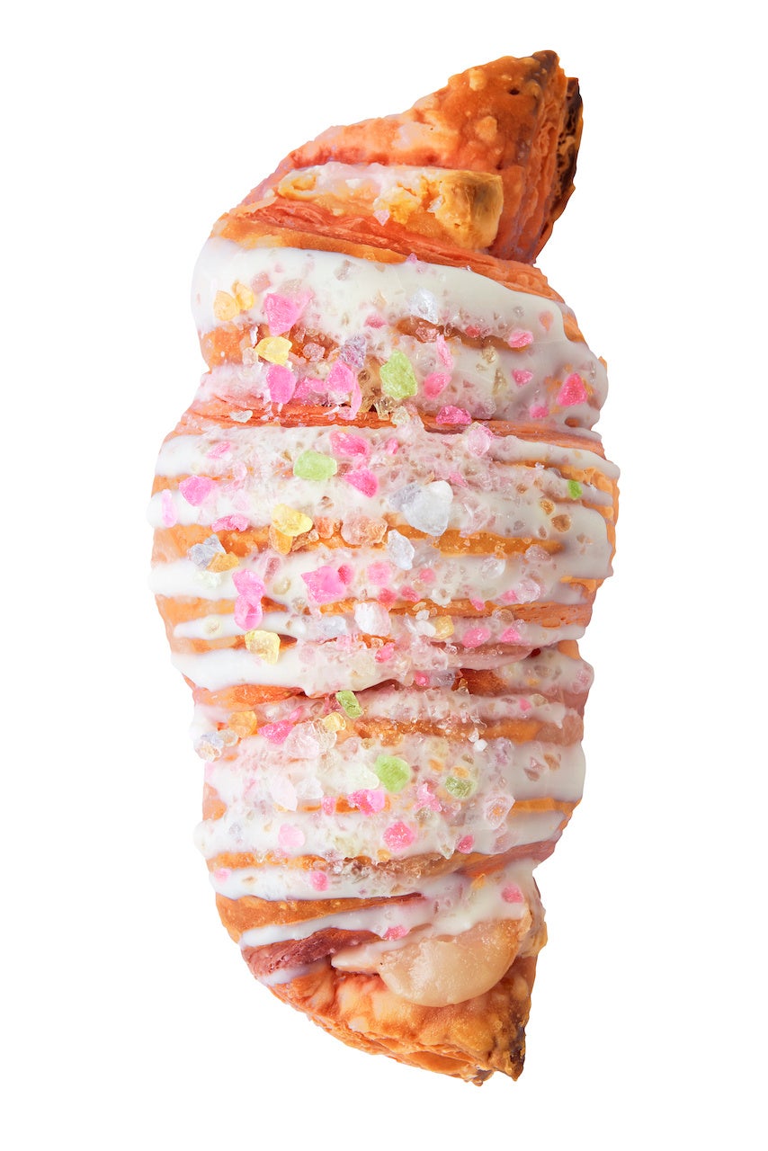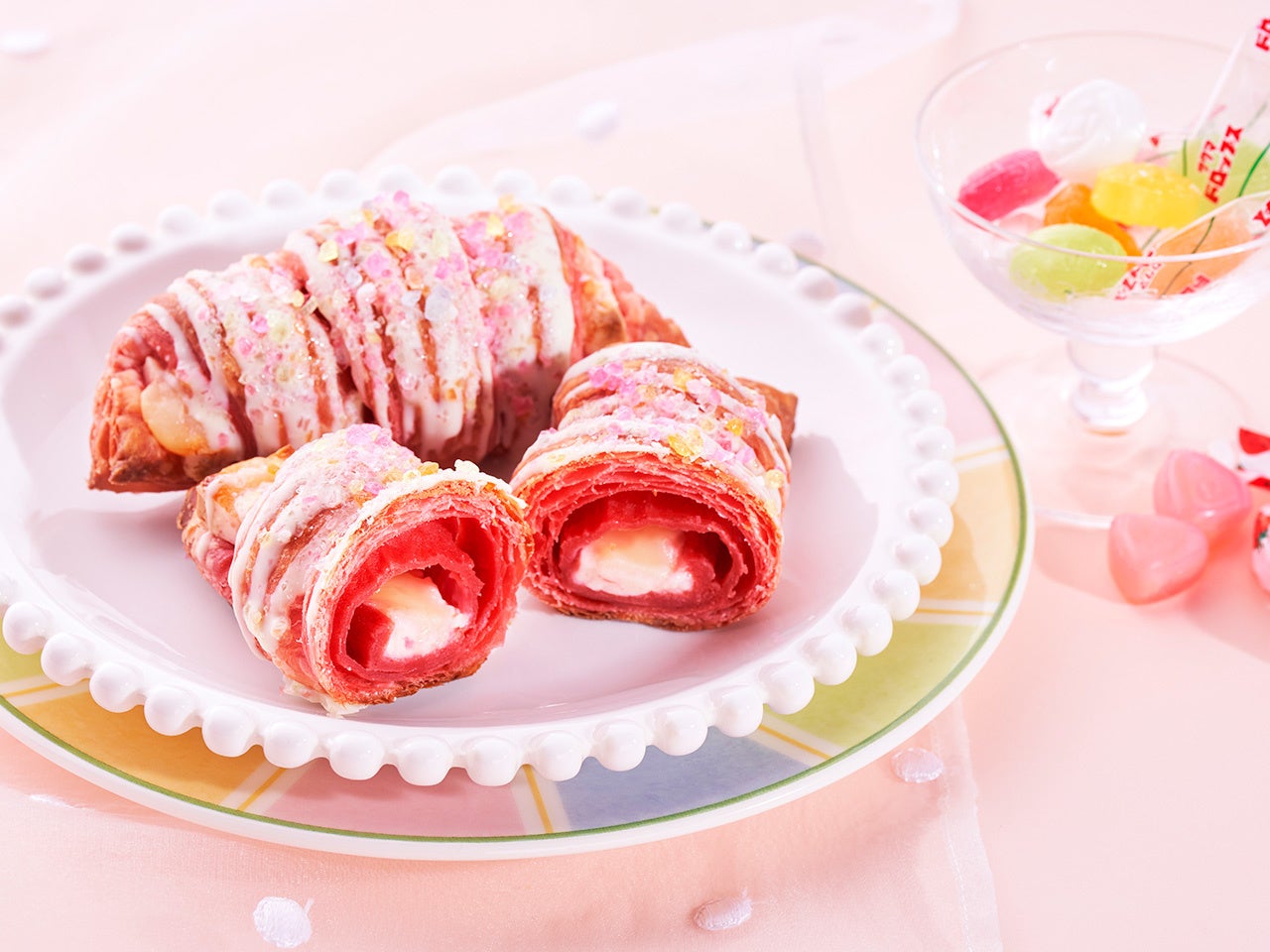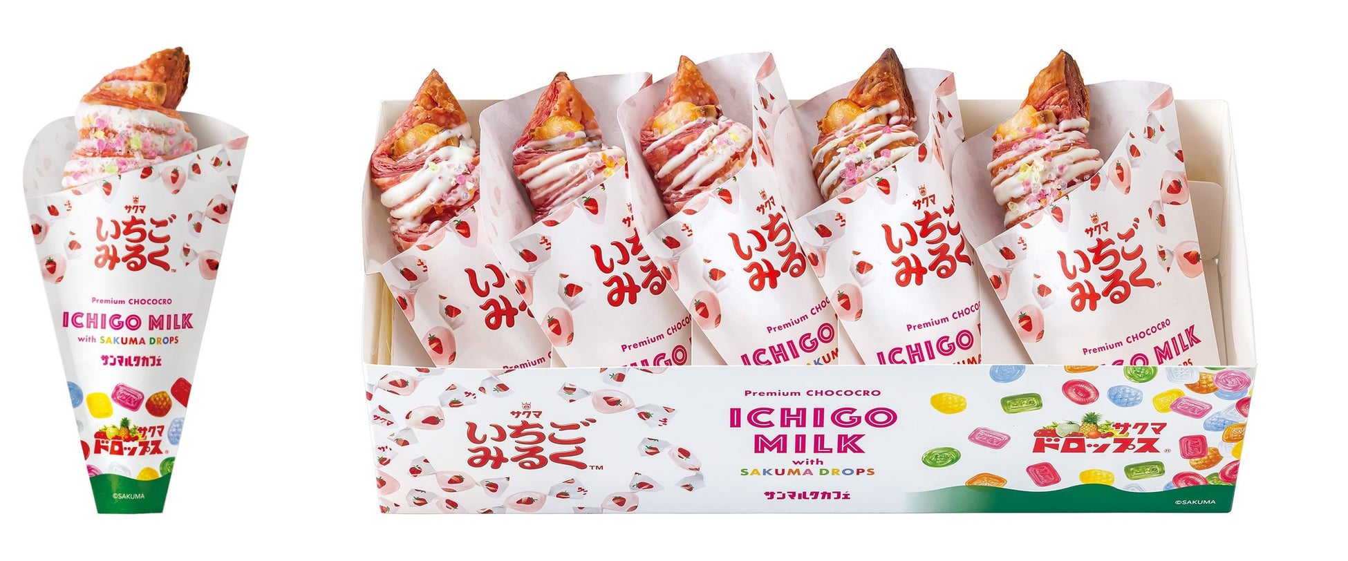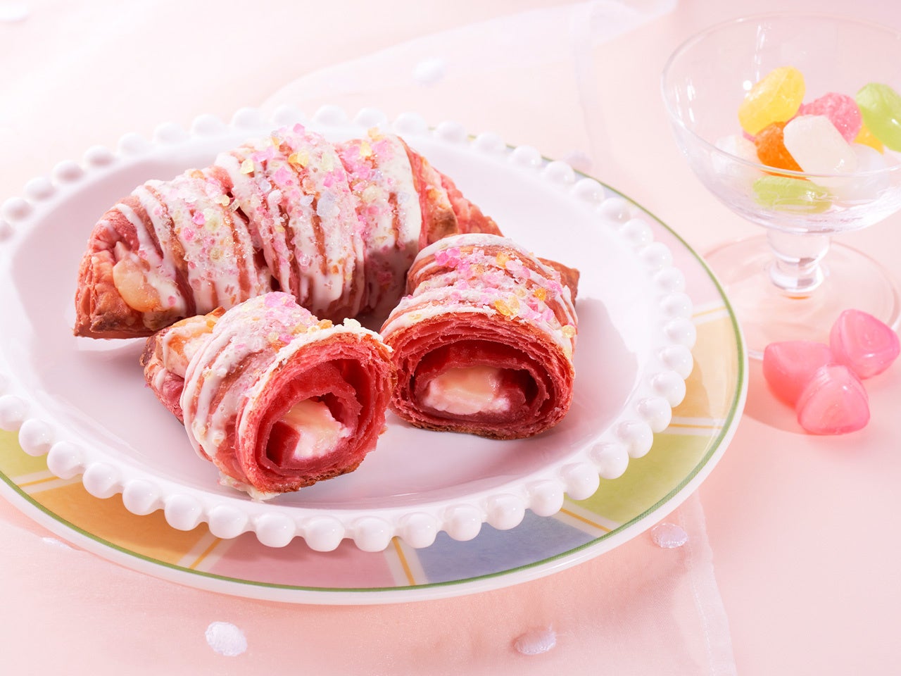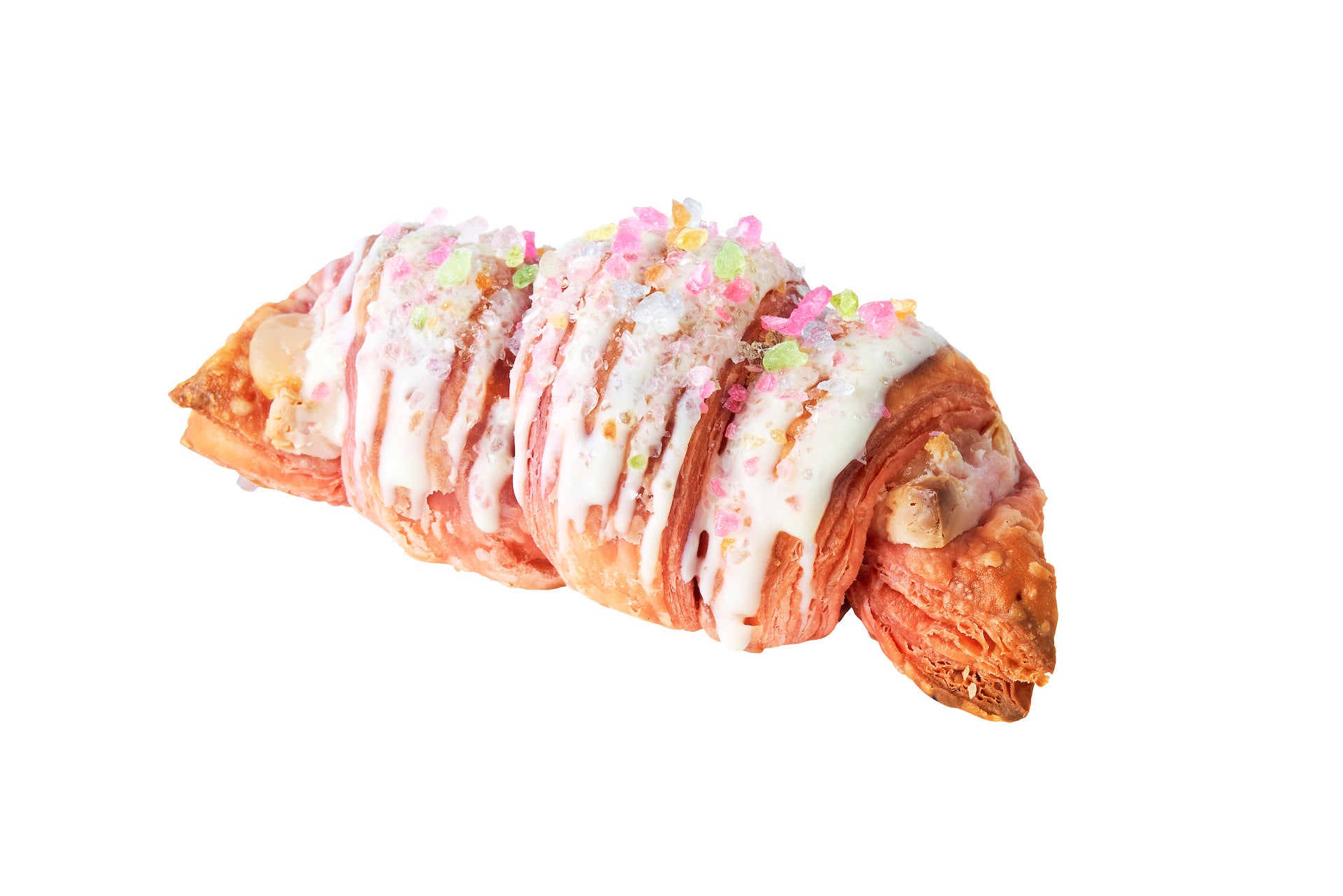 本コラボレーションを機に、福岡県産あまおうのいちごピューレを練り込んだ、ピンク色のクロワッサン生地を初めて開発。「いちごみるく」のキャンディグリッター※を練り込み、いちごみるくの甘酸っぱさとミルキーな味わいを表現したチョコレートと、北海道産の牛乳を使用し濃厚なミルクの味わいを表現したミルク風味のクリームをいちご風味豊かなクロワッサン生地で焼き上げたプレミアムチョコクロ。焼き上げた後は、ホワイトチョコレートのソースを上からかけ、さらにその上から「いちごみるく」と「サクマドロップス」をミックスしたキャンディグリッター※を振りかけています。「いちごみるく」の優しい甘さと香り、味のバリエーションが豊かな「サクマドロップス」ならではの華やかさとキャンディグリッターのパリッとした食感など、五感の全てから魅力を感じる未だかつてないチョコクロです。