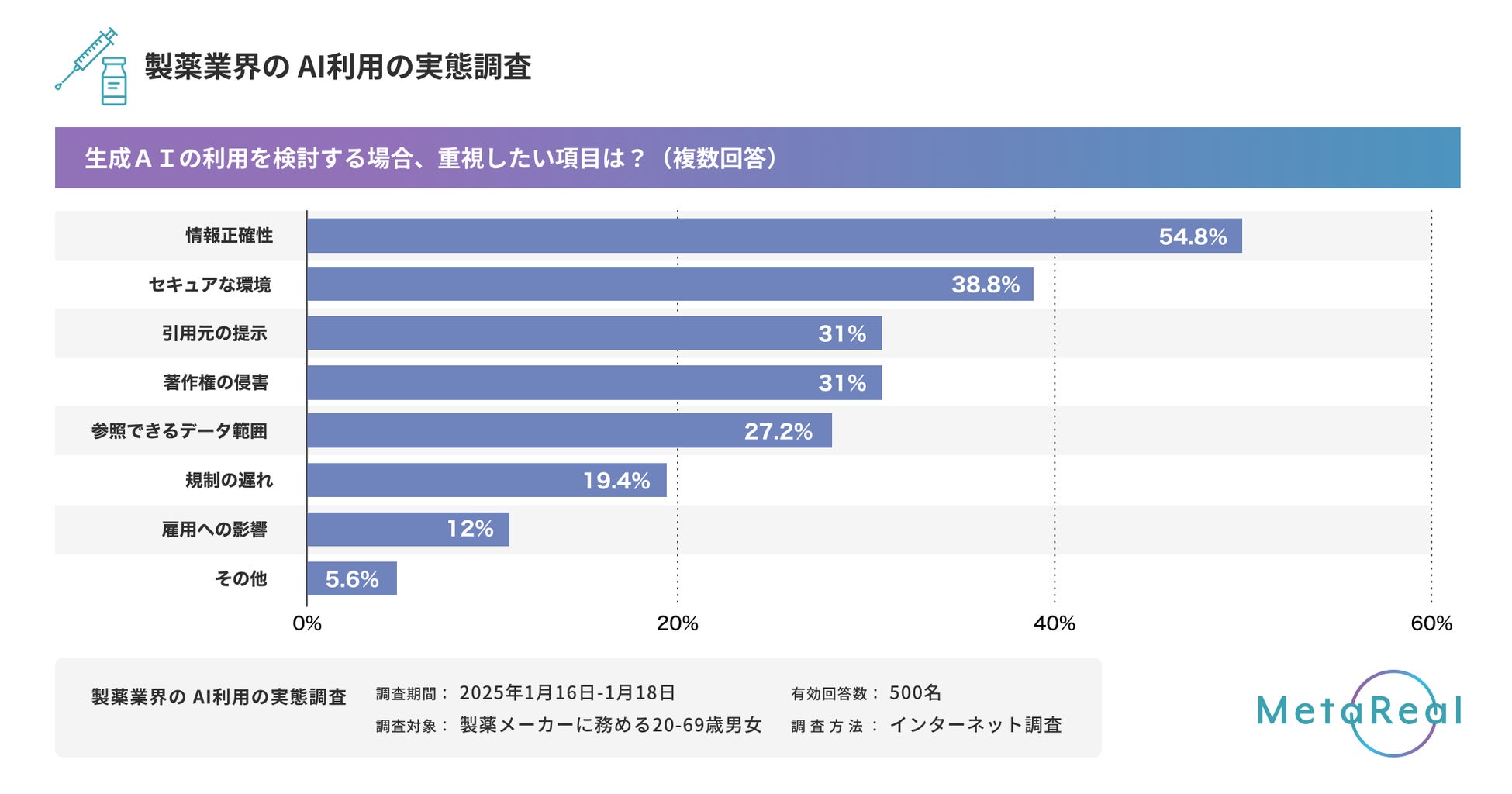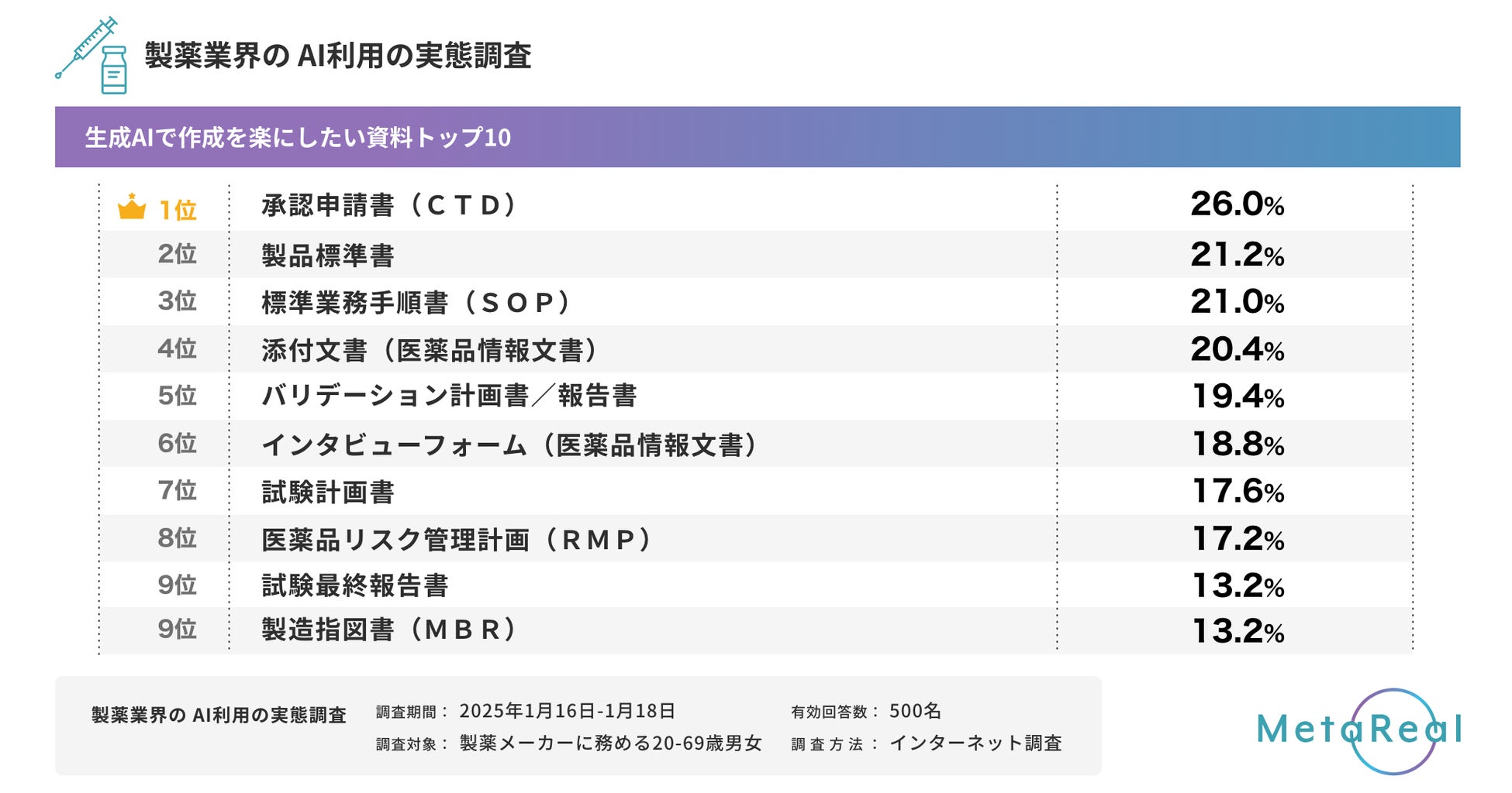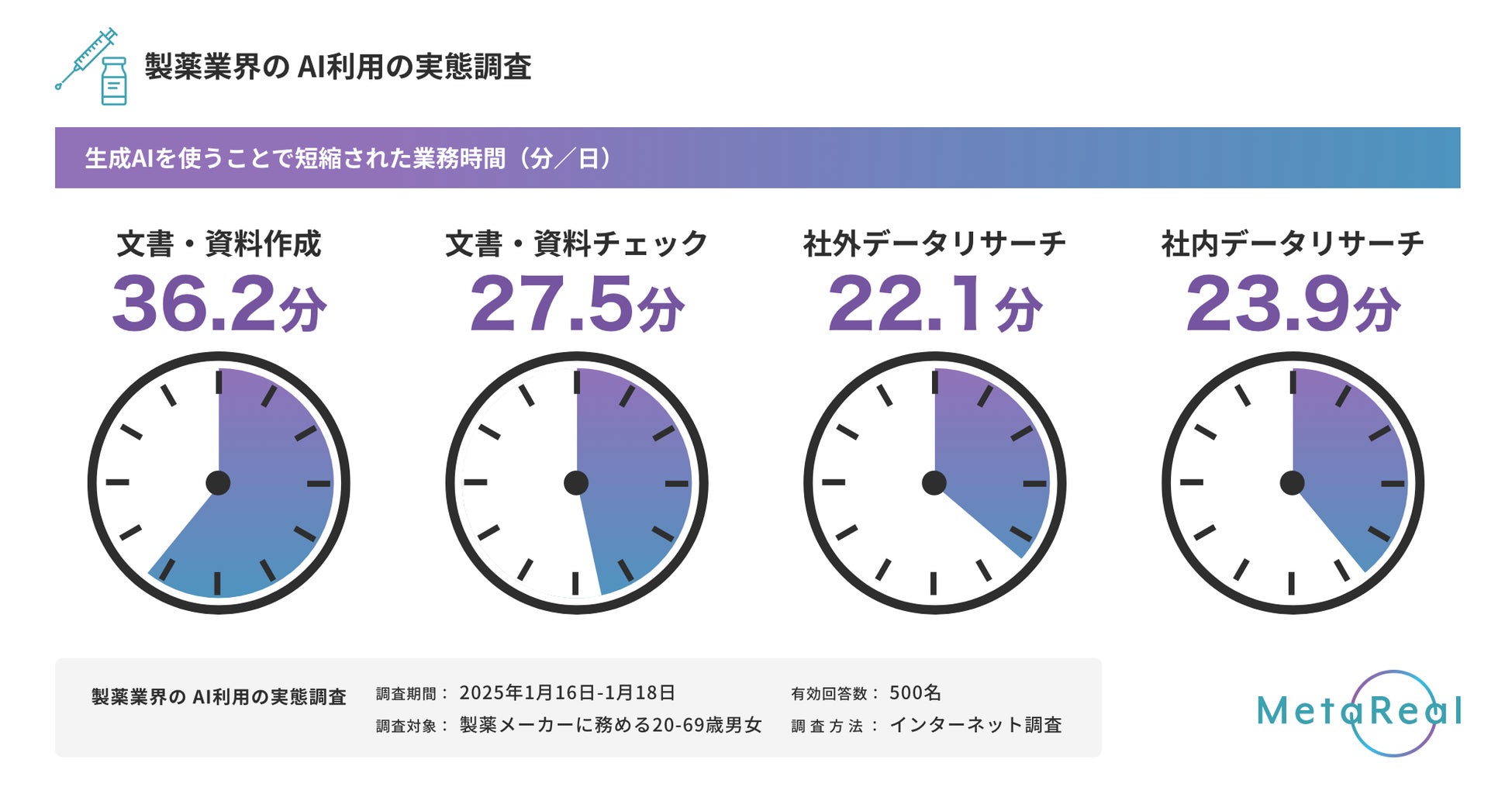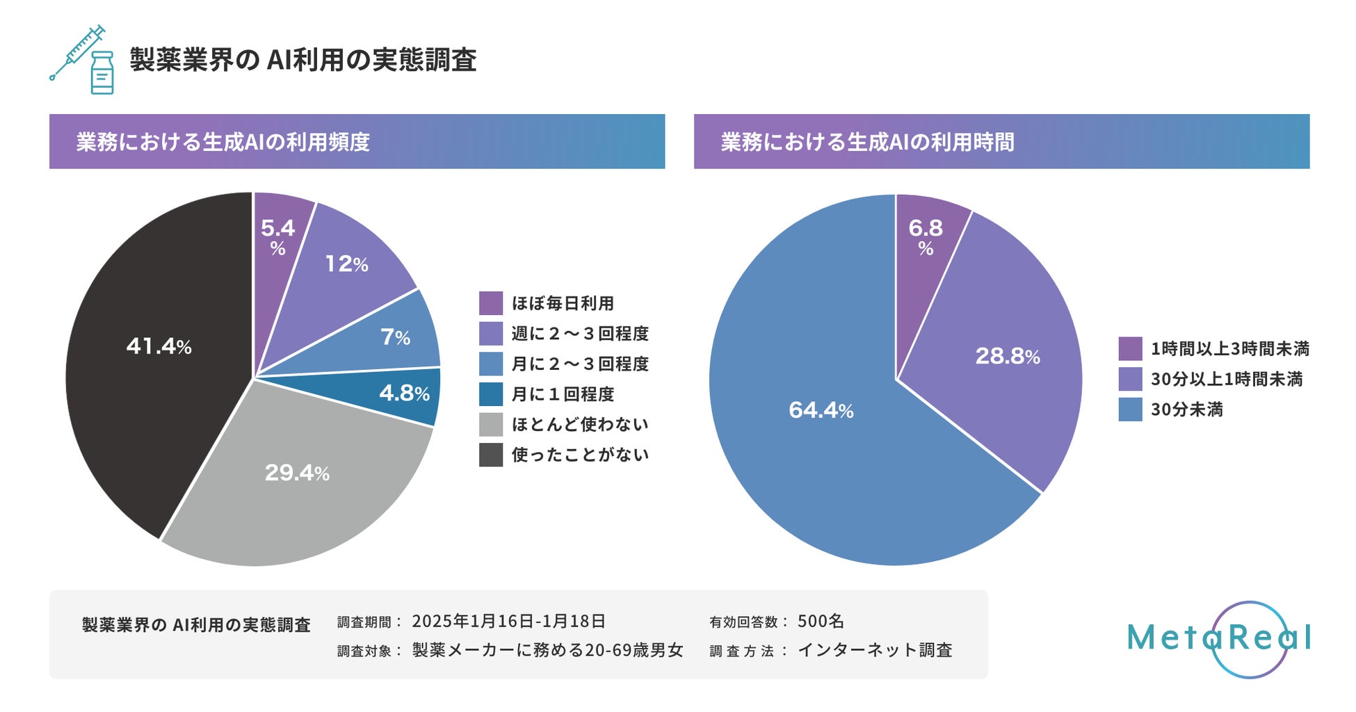 株式会社メタリアル(本社:東京都千代田区、代表取締役:五石 順一)は、2025年1月に製薬業界で働く20代~60代の男女500名を対象に、製薬業界におけるAI導入と業務内容に関するアンケートを行いました。