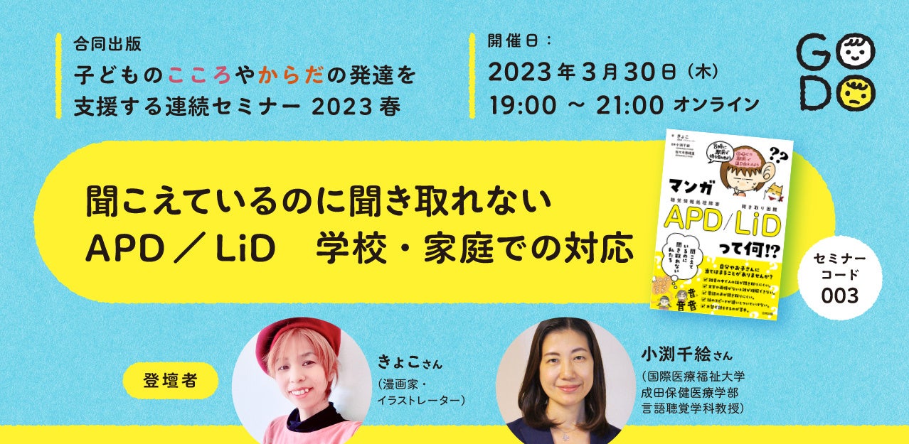 耳がキャッチした音を、脳が上手に認識できない「APD=聴覚情報処理障害/LiD=聞き取り困難」。本セミナーでは、専門家の小渕千絵先生にAPD/LiDの基本的な知識や、当事者の方への配慮について教えていただきます。また『マンガAPD/LiDって何!?』の著者きょこさんに加え、当事者・保護者の方2名にもご登壇いただき、家庭・学校での困りごとやその解決策などお話していただきます。