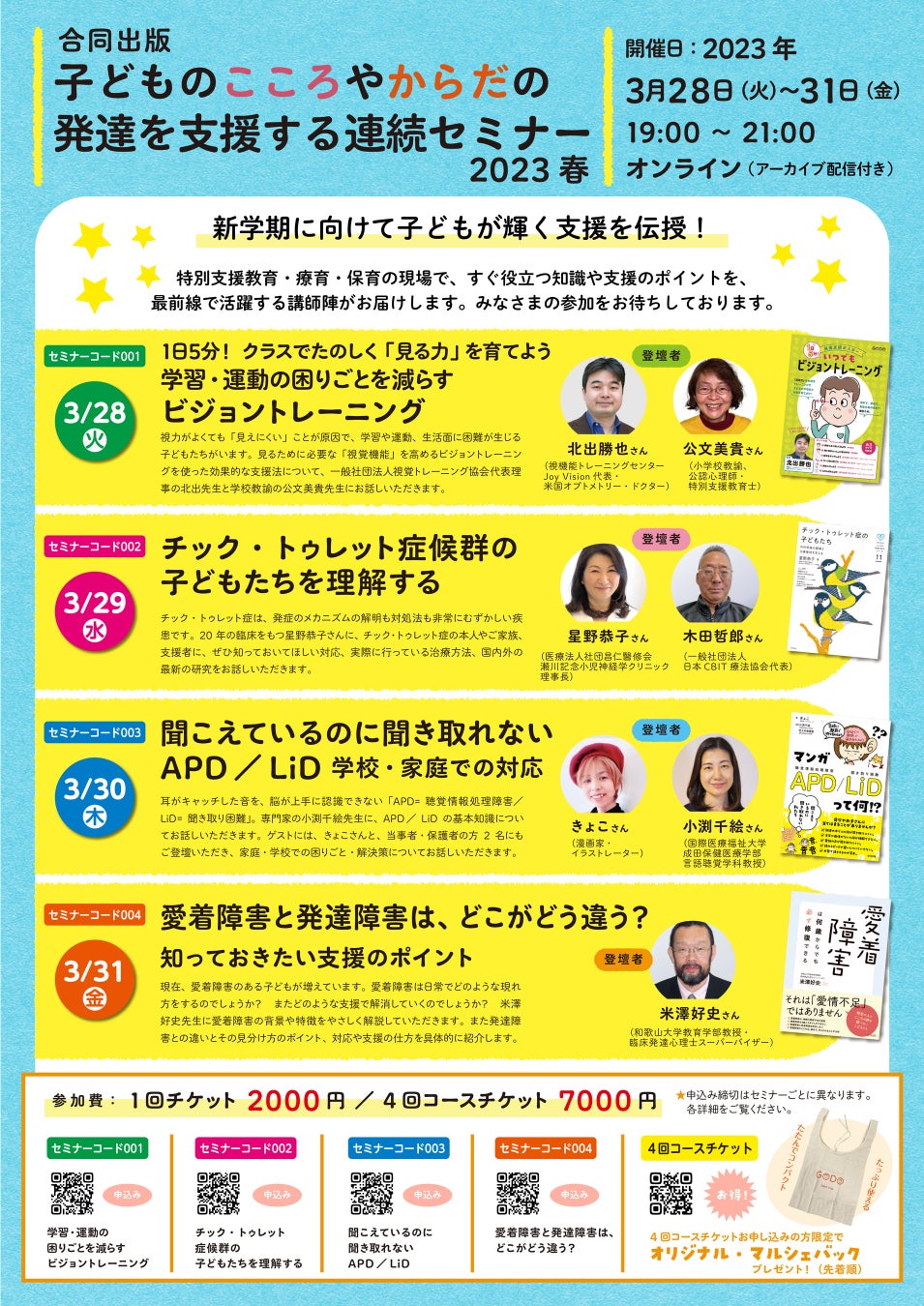 「視覚機能」を高めるビジョントレーニング、チック・トゥレット症、耳がキャッチした音を脳が上手に認識できない「APD/LiD」、愛着障害について、最前線で活躍する講師陣がオンラインでお届けするセミナーを開催致します。家庭や特別支援教育・療育・保育の現場で役立つ知識や支援のポイントが詰まっております。またセミナー当日は講師に質問ができますので、是非ご参加ください。