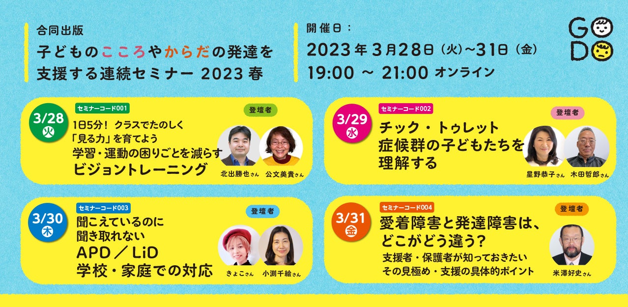 合同出版では「合同出版 子どものこころやからだの発達を支援する 連続セミナー2023春」を2023年3月28日(火)〜3月31日(金)にオンラインで開催いたします。