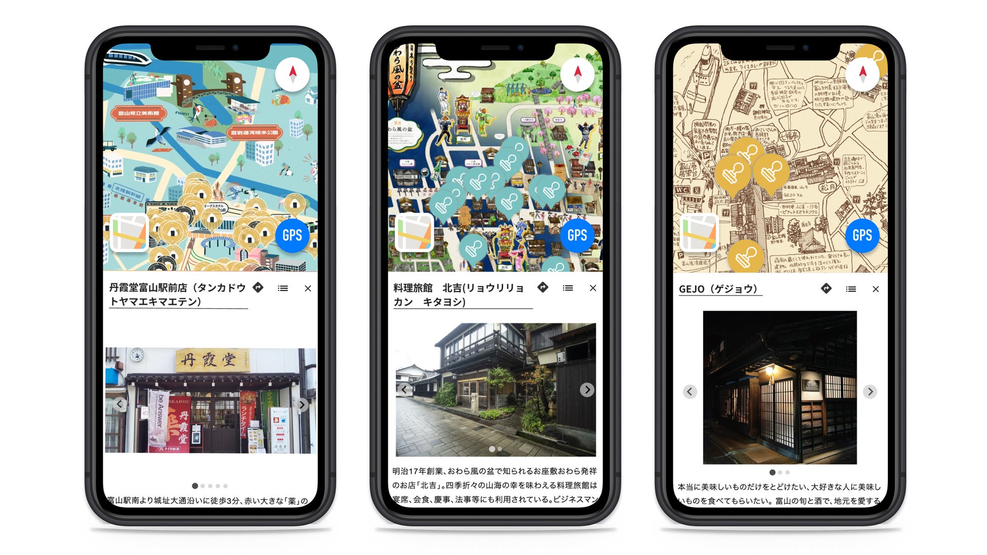 富山県富山市公式デジタルマップは、Strolyと富山県富山市が制作したイラストデジタルマップで、富山駅中心市街など市中心部の「まちなかエリア」と港町「岩瀬エリア」、今回拡充した八尾町のデジタルマップとなっています。約200[1] 店の飲食情報を地図上にまとめ、地図上や一覧から店を選ぶと、外観や料理の写真、紹介文、営業時間などの情報が見られます。また、現在地や店までの道順も調べることができます。