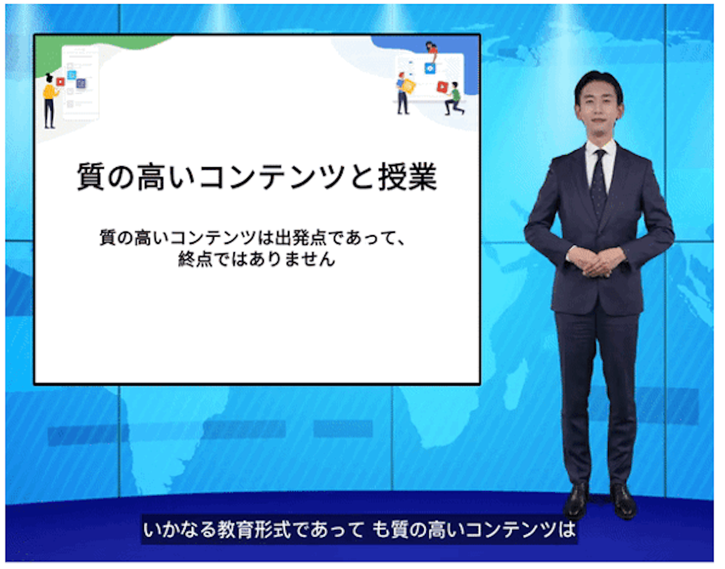 <パワーポイントをアップロードするだけで、仮想講師がジェスチャーも交えながらプレゼン内容を自動で読み上げる新バージョンの「AIビデオ」の様子>