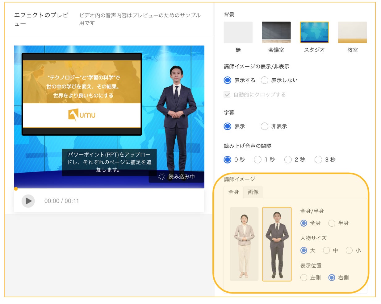 AIビデオの「全身モード」は、UMUが提供している男性または女性の仮想講師画像を選択し、全身/半身の表示、画像サイズ、表示位置を調整しコンテンツを生成します。