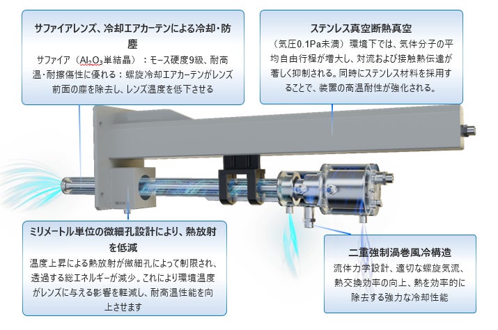二重ボルテックス空冷構造: 2,000℃に達する炉内でも内部機器を保護。