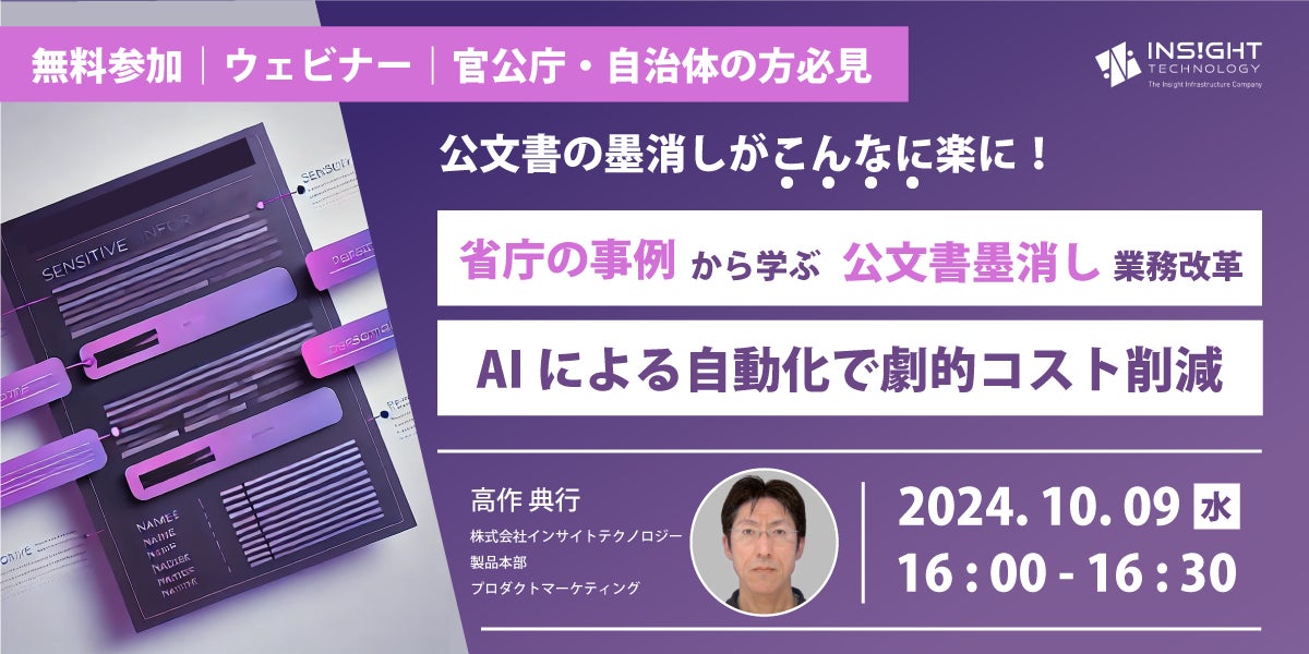 株式会社インサイトテクノロジー(本社所在地:東京都渋谷区、代表取締役社長 CEO:森田 俊哉、以下:インサイトテクノロジー)は、2024年10月9日に官公庁・自治体担当者向けセミナー「事例から学ぶ公文書墨消し業務改革|AIによる自動化で劇的コスト削減」を開催することをお知らせします。