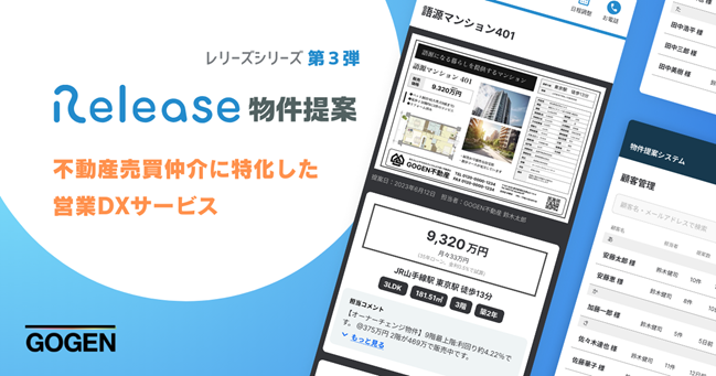 電子契約等ワンストップの不動産売買手続き基盤である不動産売買DXX*プラットフォーム「Release(レリーズ)、以下:レリーズ」を開発・提供するGOGEN株式会社(本社:東京都港区、代表取締役CEO:和田 浩明)は、不動産売買仲介向けの物件提案・追客サービス「Release(レリーズ)物件提案、以下:レリーズ物件提案」をリリースしましたのでお知らせします。