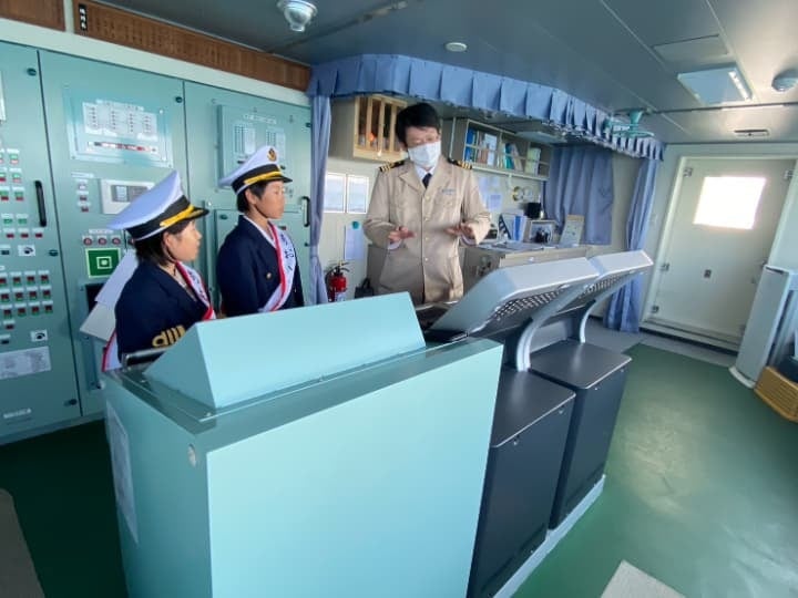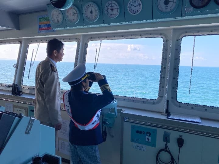 ブリッジに上がり、お客様への船内アナウンスをしたり、海上の見張りなどを行います。