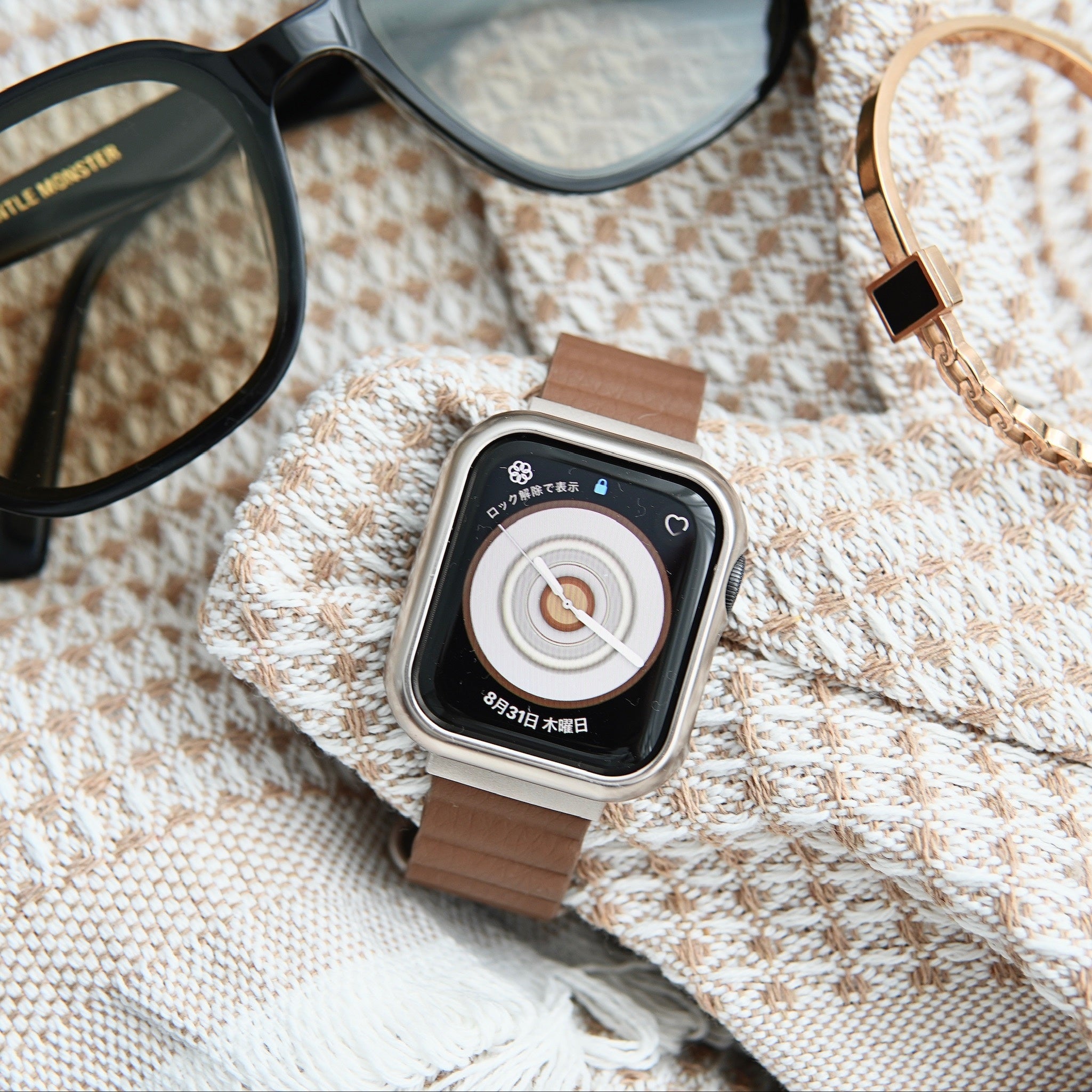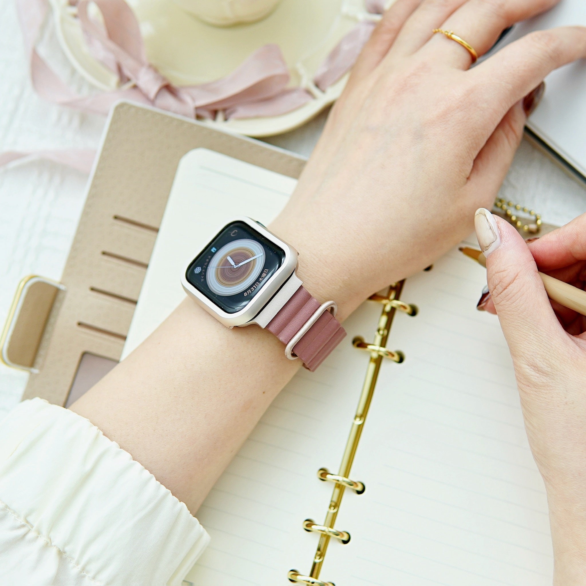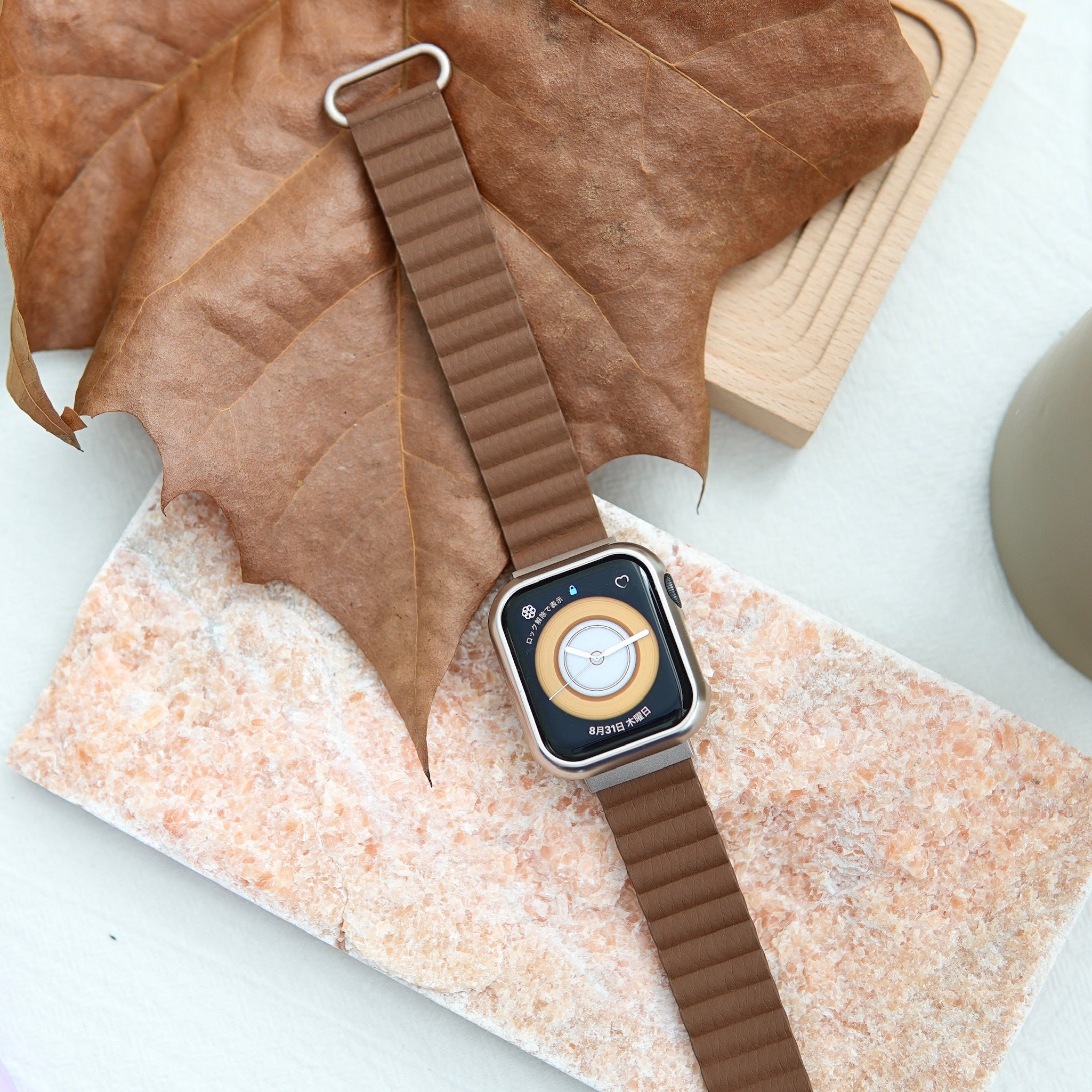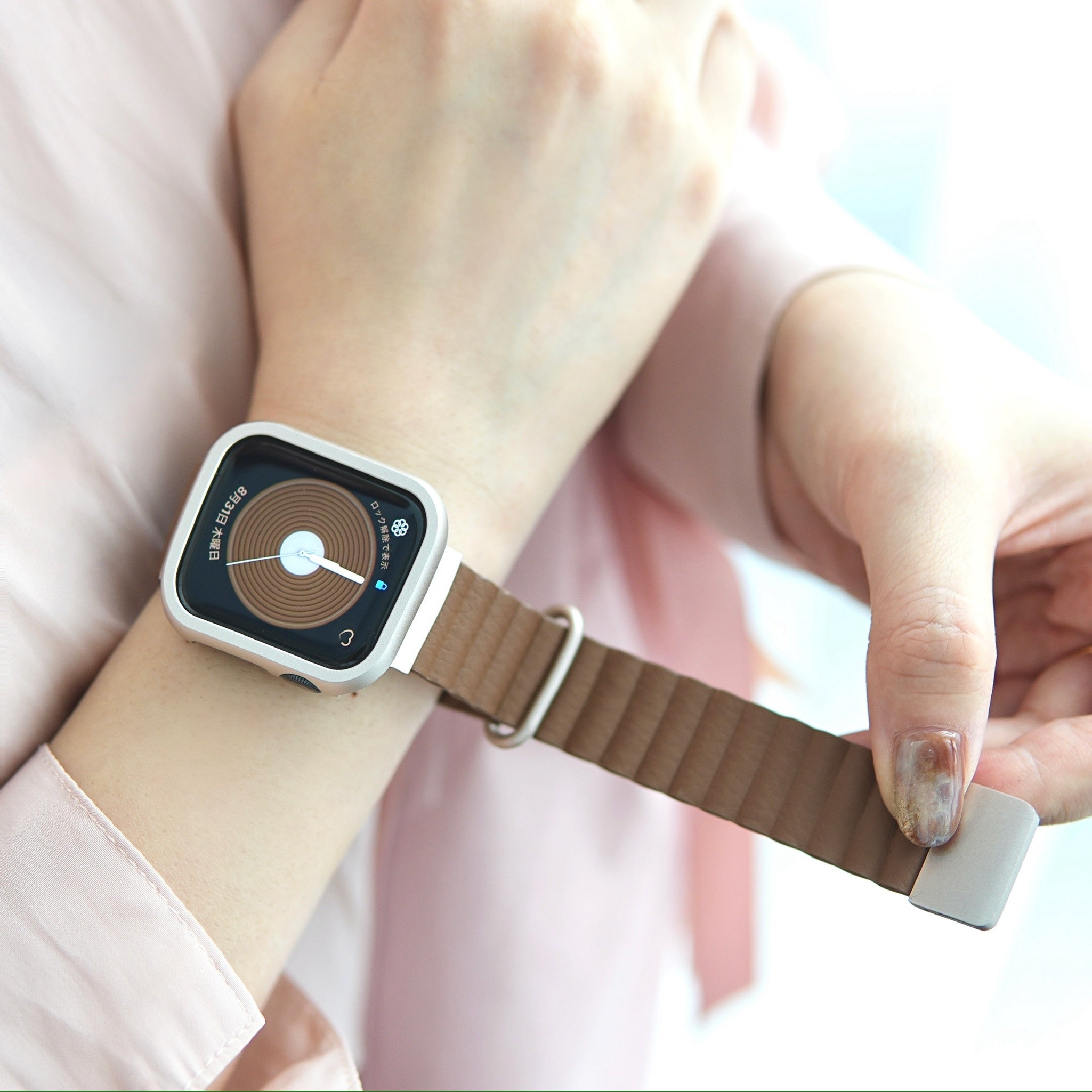 金具部分はアップルウォッチ人気カラーのスターライトと相性が良い色味を取り入れ、少しくすみがかった大人で上品な雰囲気を纏います。