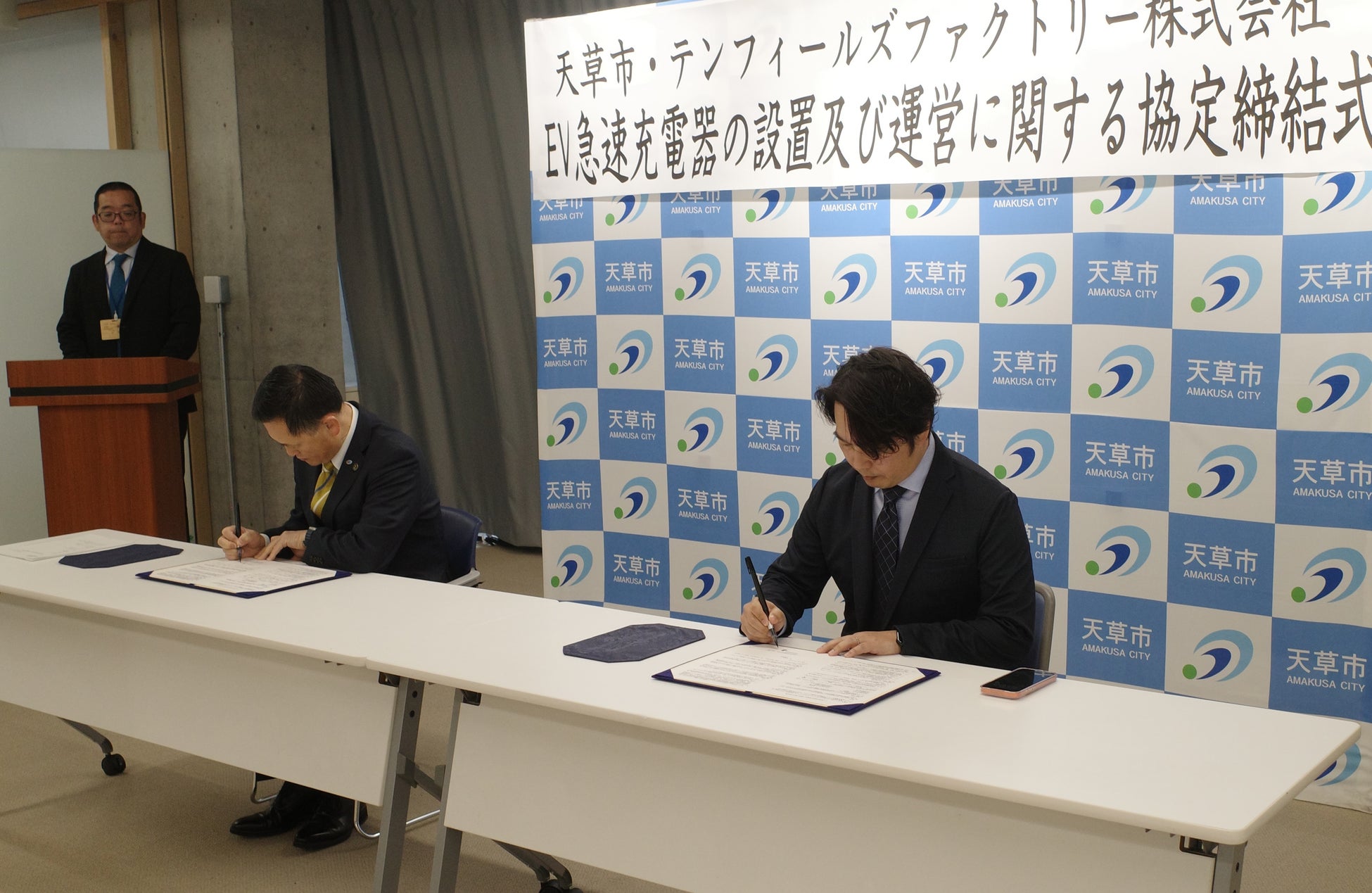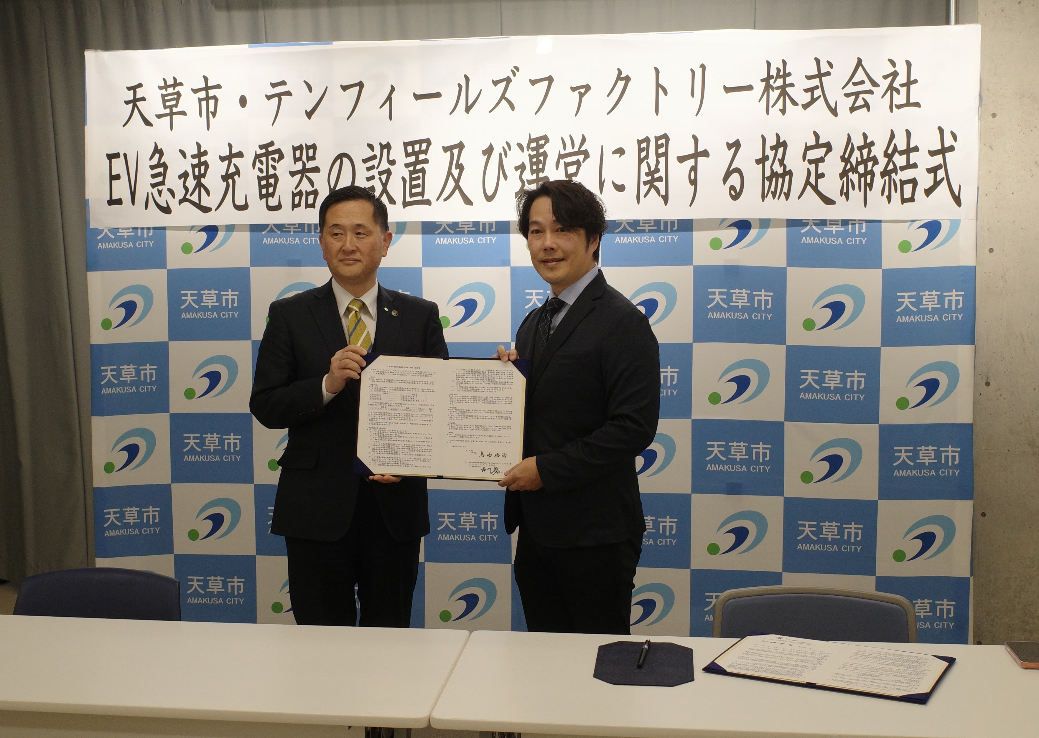 テンフィールズファクトリー株式会社(本社:京都府相楽郡精華町光台1-7けいはんなプラザ9F、代表取締役:市川 裕、以下「当社」)は、2026年1月28日、熊本県天草市役所にて、天草市の市長である馬場 昭治様と、天草市と当社における「EV急速充電器の設置及び運営に関する協定」の締結式を執り行いました。