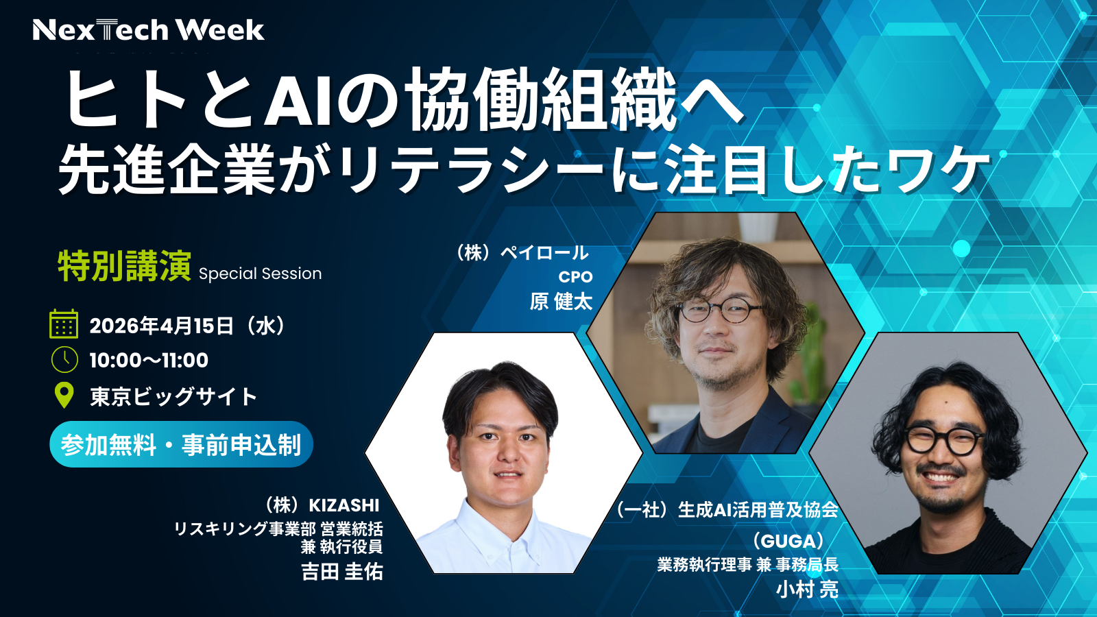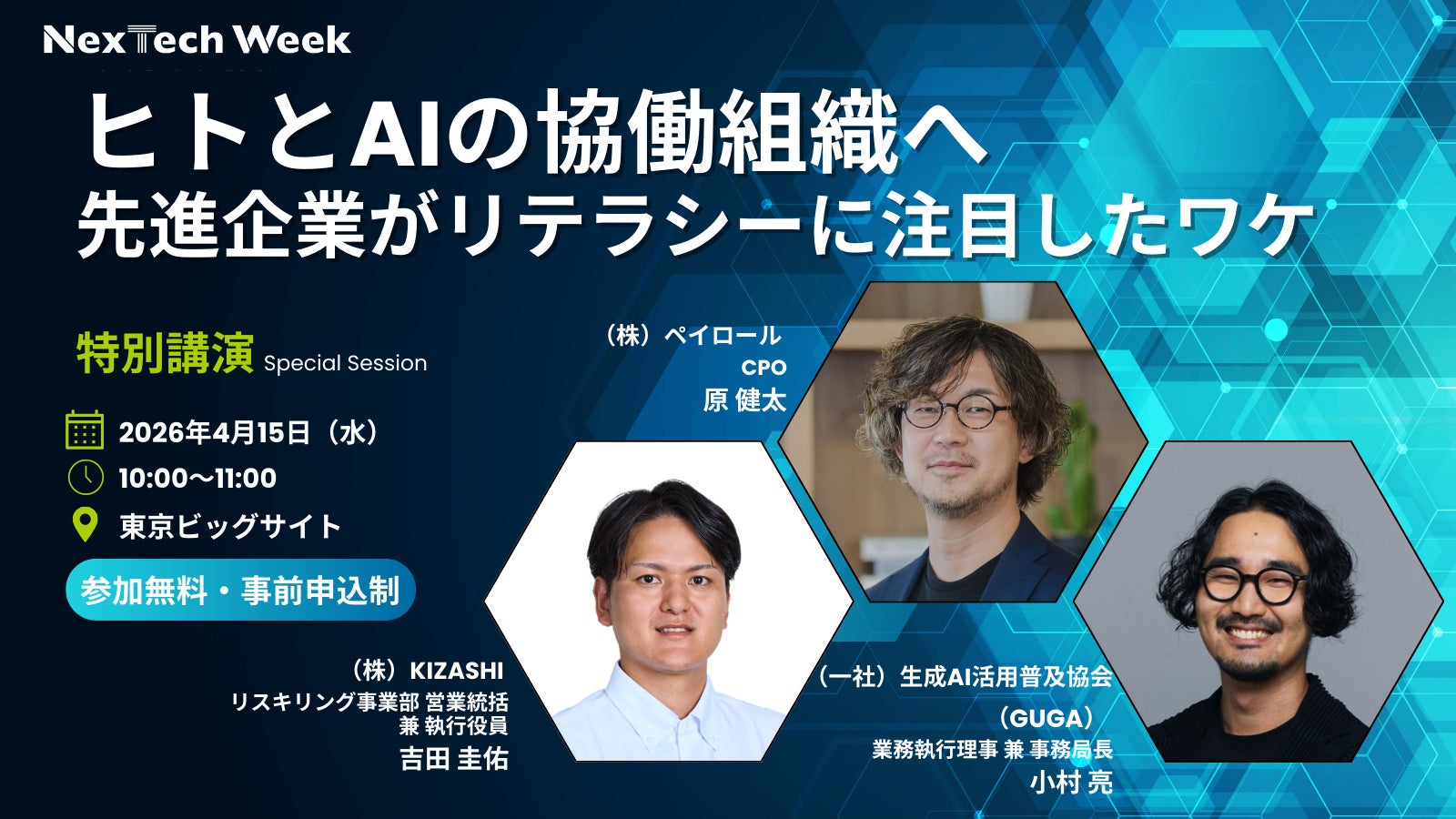 本展示会内で800名規模のステージで行われる「NexTech Week セミナー」にて、KIZASHIは特別講演として、株式会社ペイロール(本社:東京都江東区、代表取締役社長CEO:湯浅哲哉、以下:ペイロール)およびGUGAとともに登壇いたします。本講演では、「ヒトとAIが協働する組織」の実現に向けて必要な取り組みについて、KIZASHIがモデレーターを務め、パネルディスカッション形式で議論。AIツール導入のよくある失敗やAI活用の二極化に対する処方箋、AIリテラシー向上がもたらす効果などについて、先進企業であるペイロールの実践事例を交えながら、次の一歩を見つけるためのヒントをお届けいたします。