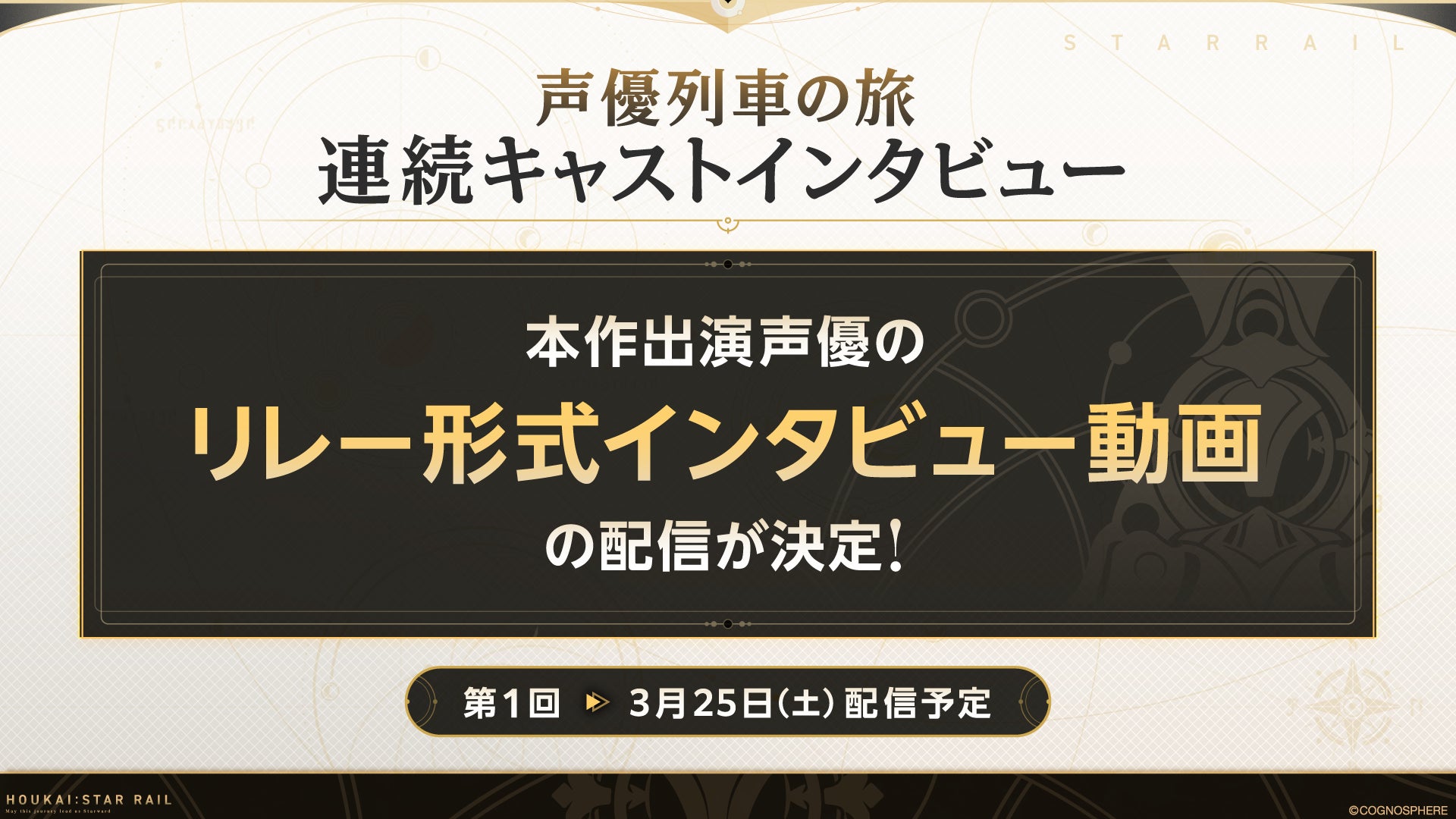 正式リリース日公開を記念して、3月25日(土)より崩壊:スターレイル公式YouTubeチャンネル、公式Twitterにて「声優列車の旅 連続キャストインタビュー」動画を配信いたします。