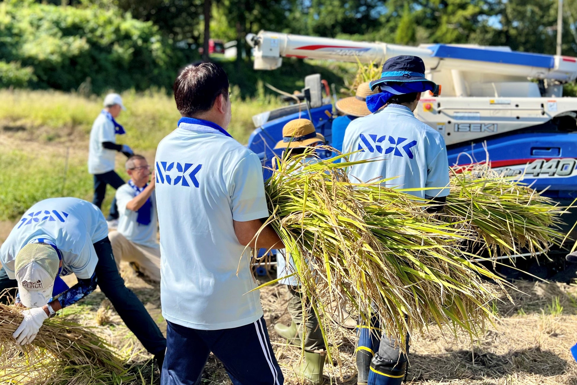 NOK株式会社(本社:東京都港区芝大門、代表取締役 社長執行役員 グループCEO:鶴 正雄、以下「NOK」)は、地域の地下水の保全活動の一環として、公益財団法人 くまもと地下水財団が実施する「水田オーナー制度」に2019年から協賛しています。本年の活動として、10月12日(土)に、NOK熊本事業場(熊本県阿蘇市)の社員とその家族の計35人が、熊本県菊池郡大津町の水田で、地域の生産者の皆様と共に稲刈り作業を行い、地域の豊かな土壌と豊富な水で育まれたお米の収穫を楽しみました。