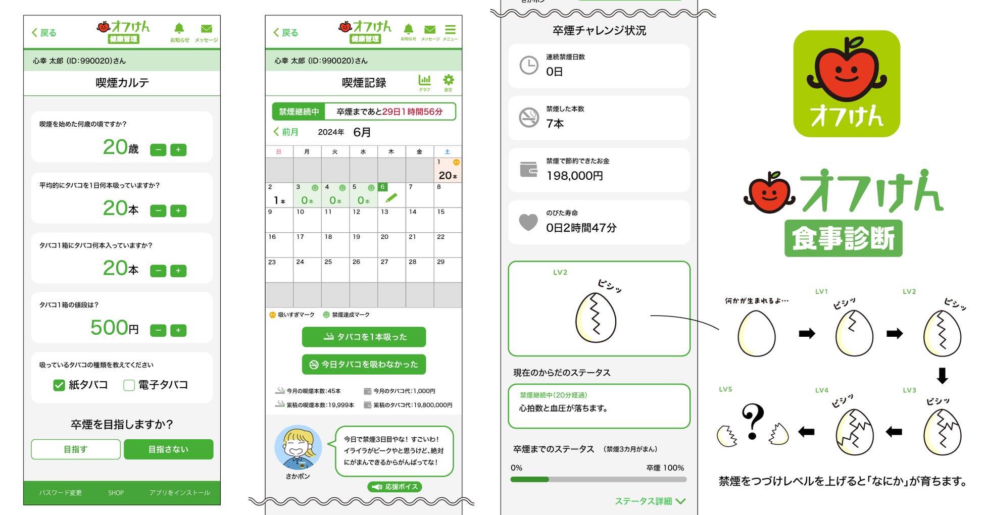 「オフけん健康管理アプリ」は、厚生労働省推奨項目を網羅した「ストレスチェック」及び、厚生労働省が推進している「健診結果のデータ化」ができるアプリです。このたび、「オフけん健康管理アプリ」の中に、「卒煙チャレンジ」も登場!喫煙や受動喫煙の害、禁煙方法などについて動画を配信します。貴社の業務形態に合わせたオリジナル動画も制作可。動画を視聴後、健康管理アプリにて禁煙や喫煙本数を記録します。3ヶ月間禁煙し、卒煙できた方には健康グッズをプレゼント。禁煙レベルが上がると「なにか」が育つ仕掛けも!?