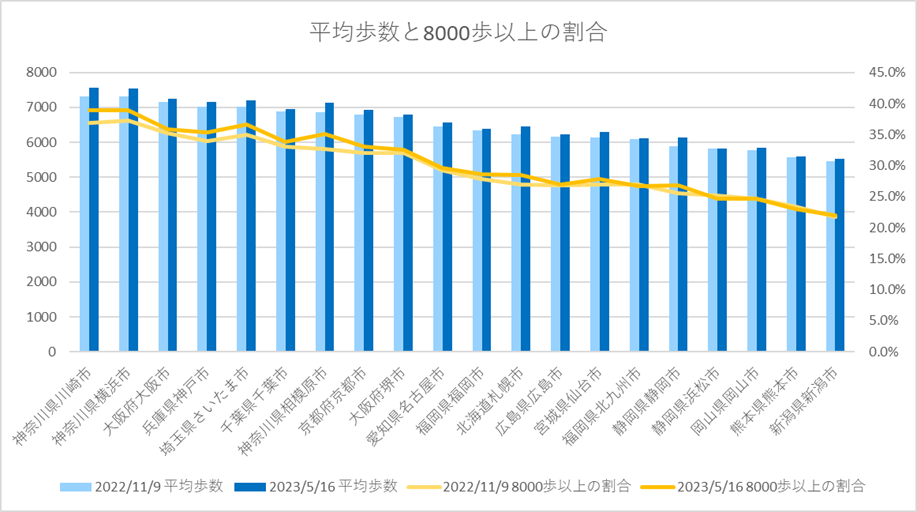 一方、最も平均歩数が低かった新潟市では、川崎市よりも平均で約2,000歩低く、比較的人口規模の大きい政令指定都市に限定しても、地域間格差が大きいことが示されました。