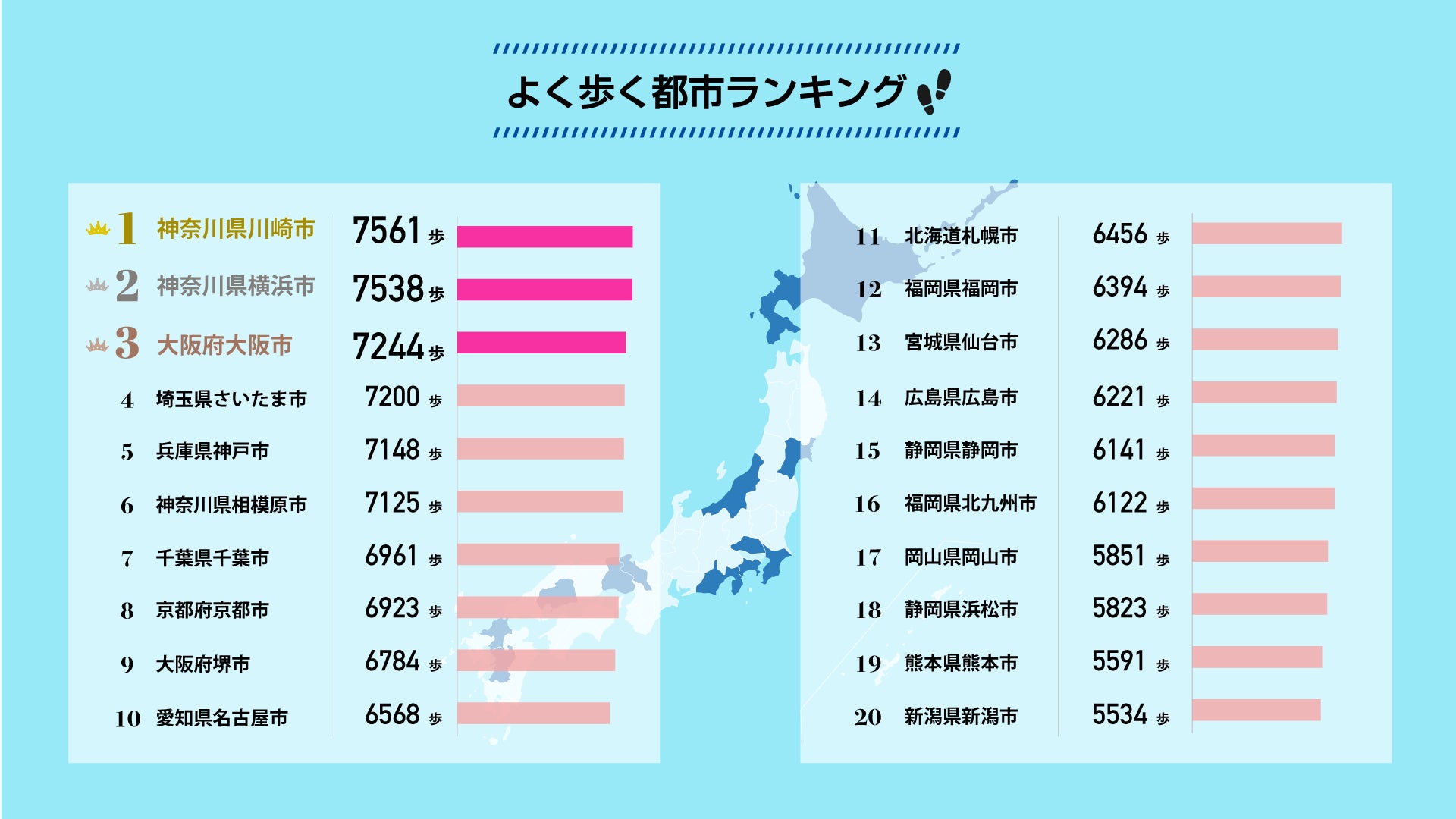 全国400万人の歩数データから「よく歩く都市ランキング」を発表、川崎市と新潟市で2000歩以上の地域差が判明