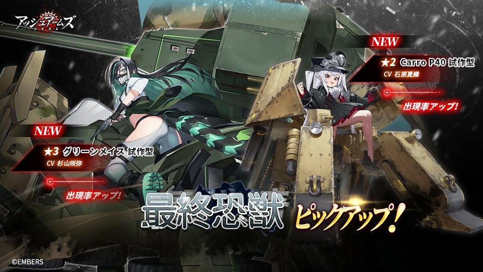同時に開催される新規召集「最終恐獣」では、グリーンメイス 試作型」、そして同じ新登場のDOLLS「Carro P40 試作型」がピックアップされ確率アップします。