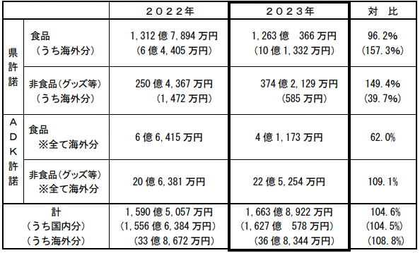 非食品(グッズ等)は、約125.7億円(46.4%)増加し、食品は、昨年より約52.3億円(4.0%)減少しました。