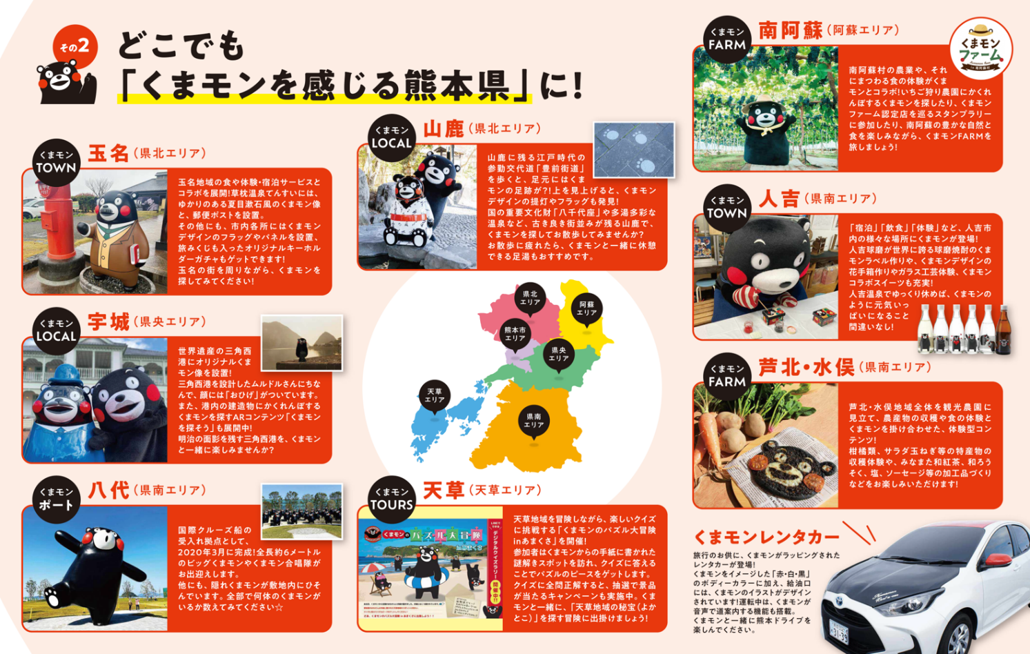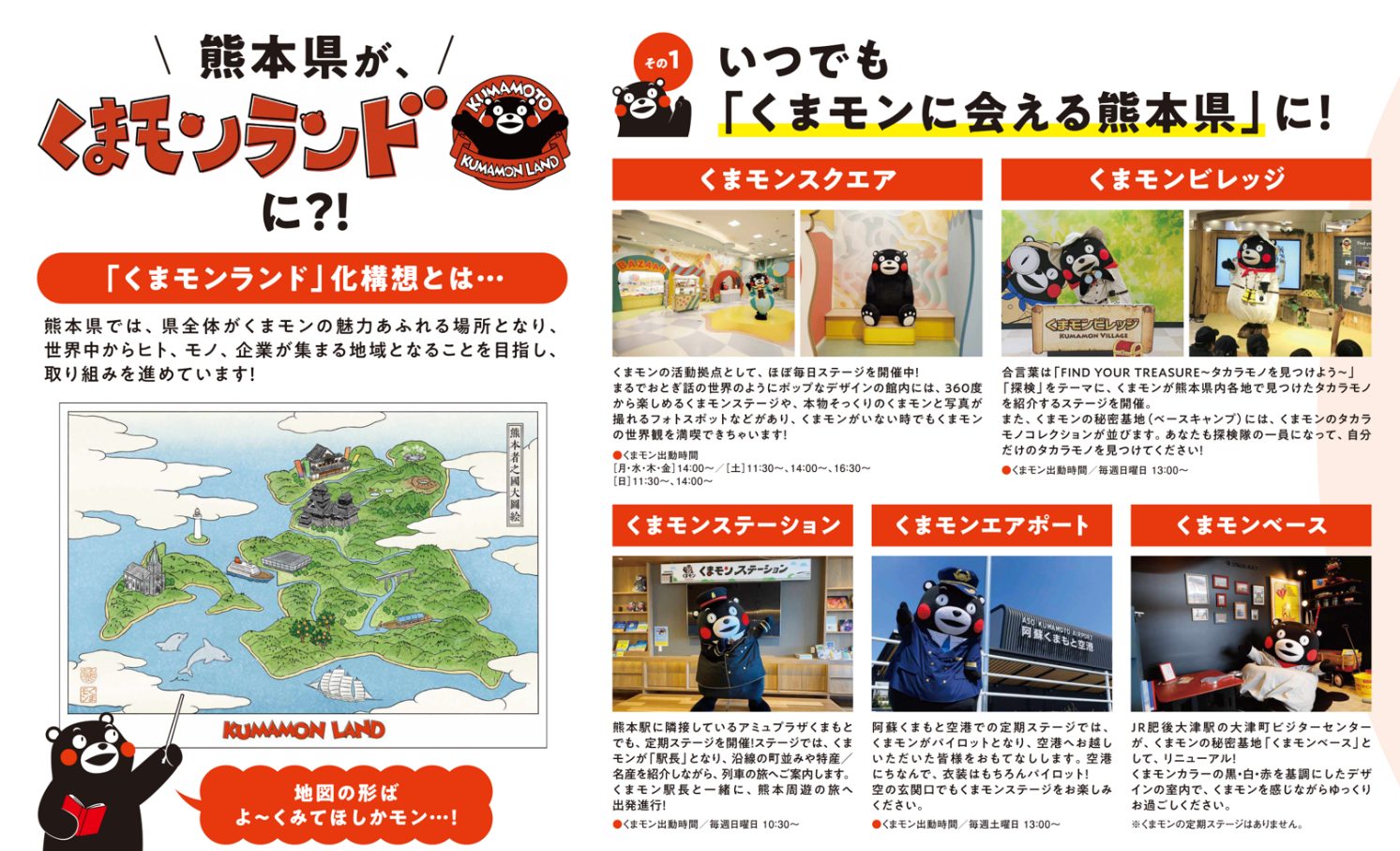 熊本県全体がくまモンの魅力あふれる場所となり、世界中からヒト、モノ、企業(ビジネスの活性化)が集まる地域となることを目指すものです。くまモンランドでは、4つのカテゴリーでくまモンを「知る」「観る」「楽しむ」「ふれあう」ことができます。