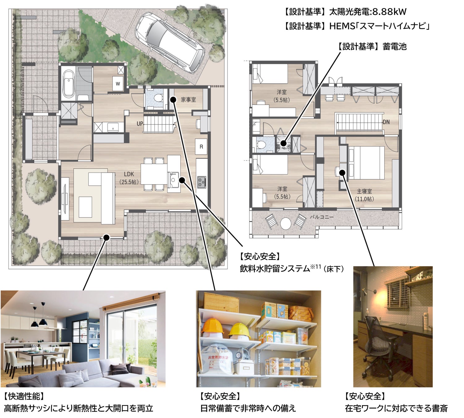 近年では自然災害の頻発化・激甚化が進んでおり、地球温暖化の影響でその傾向は今後も続くことが予想されています。『ミライクラス+』は、災害時にもライフラインを維持し、在宅避難が可能な性能を搭載した住まいです。一次取得者層や子育て層の暮らしの不安を解消し、家族との平穏な毎日を将来にわたり提供することを目指します。