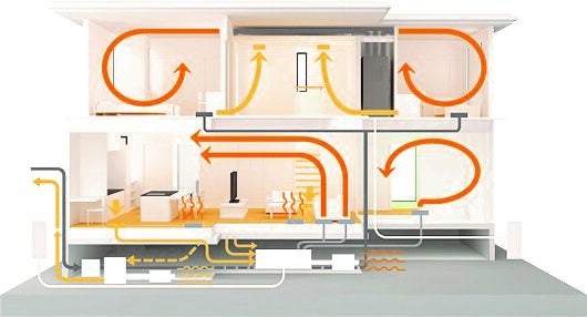 さらに、鉄骨系住宅では熱交換型第一種換気・空調システム「快適エアリー」を採用。冬場は床下から暖かな空気を循環させ、居室と廊下や脱衣所、トイレなど非居室の温度差を少なくすることで、寒さを軽減し、家じゅう快適(※8)に過ごすことができます。