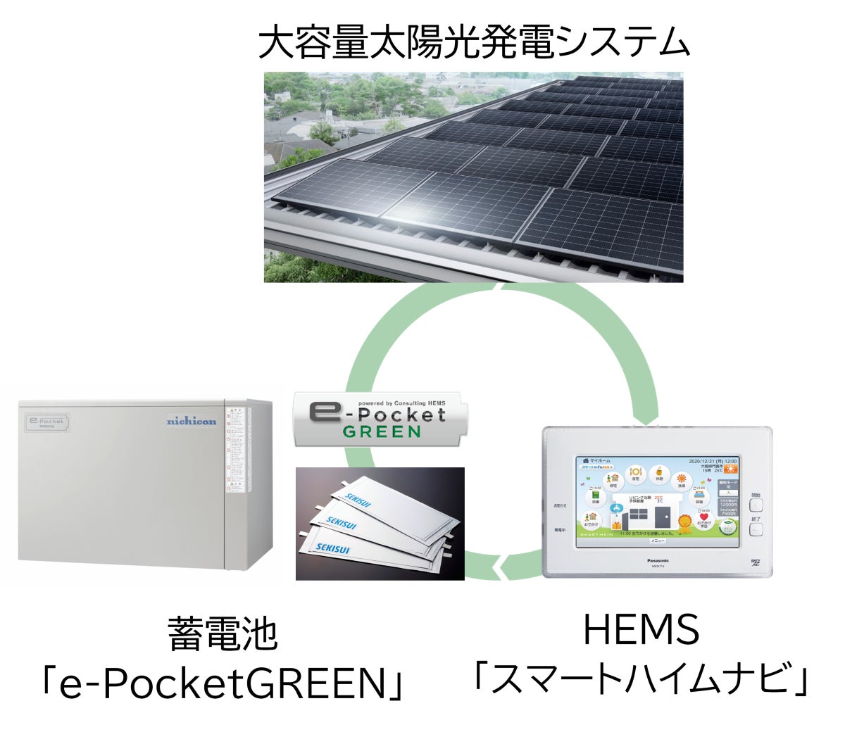 大容量PVと蓄電池「e-PocketGREEN」、効率的に電力をコントロールするHEMS「スマートハイムナビ」を搭載し、8.88kWの大容量PVと12kWh(※5)の大容量蓄電池を採用したモデルプランの試算(※6)では、1年間に使用する電力の最大約70%を、発電時にCO2を排出しないクリーンなPVエネルギーで賄うことが可能となります。また、電力会社から購入する電気を抑えることができるため、年間光熱費は蓄電池を設置しない電気ガス併用の一般住宅と比較して約30万円削減することが見込まれます(※6)。地球環境への貢献はもとより、今後も不透明感が続く電気代変動リスクを軽減することも期待できます。