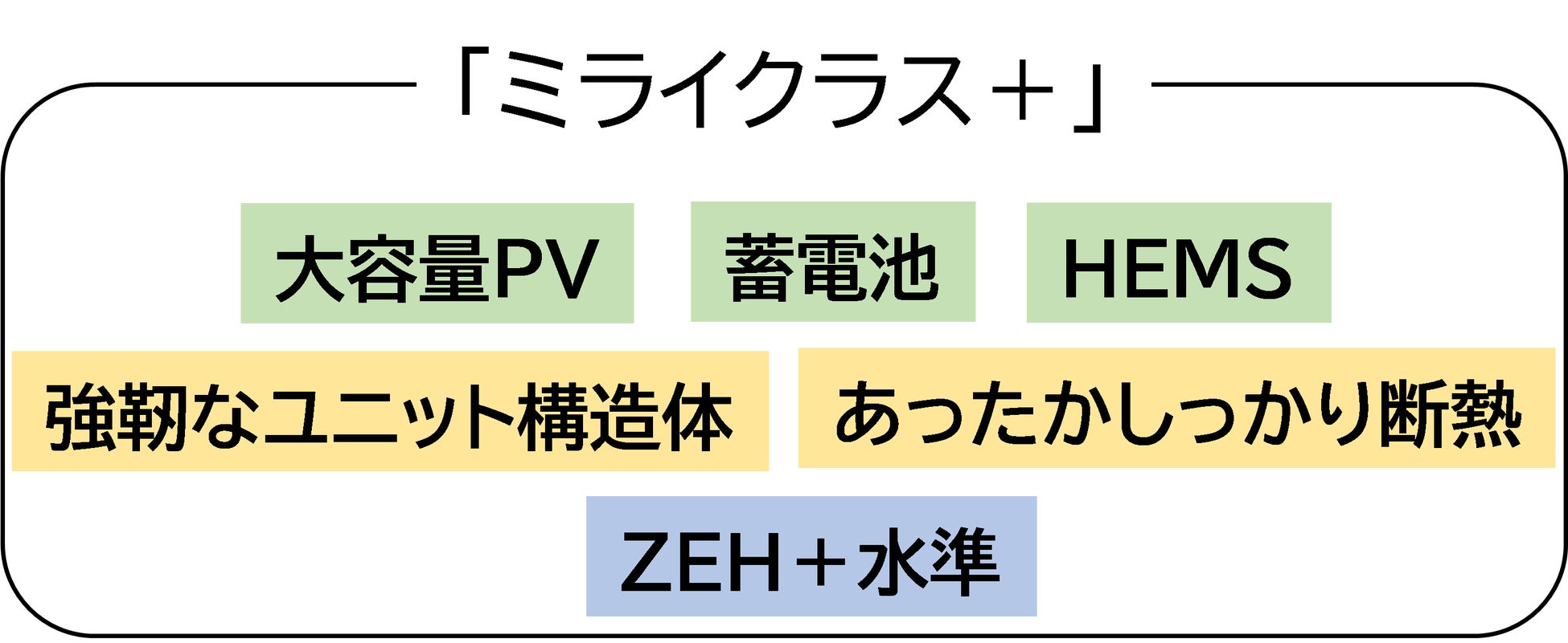 『ミライクラス+』は、国のエネルギー政策・基準を先取りし、エネルギー削減率や自家消費率を高めたZEH+に適合し、更に上回る住性能を備えた商品パッケージとして企画・開発しました。断熱等級6相当の断熱性能(※1)と蓄電池を標準搭載し、「環境貢献」「経済性」「快適性」さらに「レジリエンス性」を兼ね備えた暮らしの普及拡大を目指します。