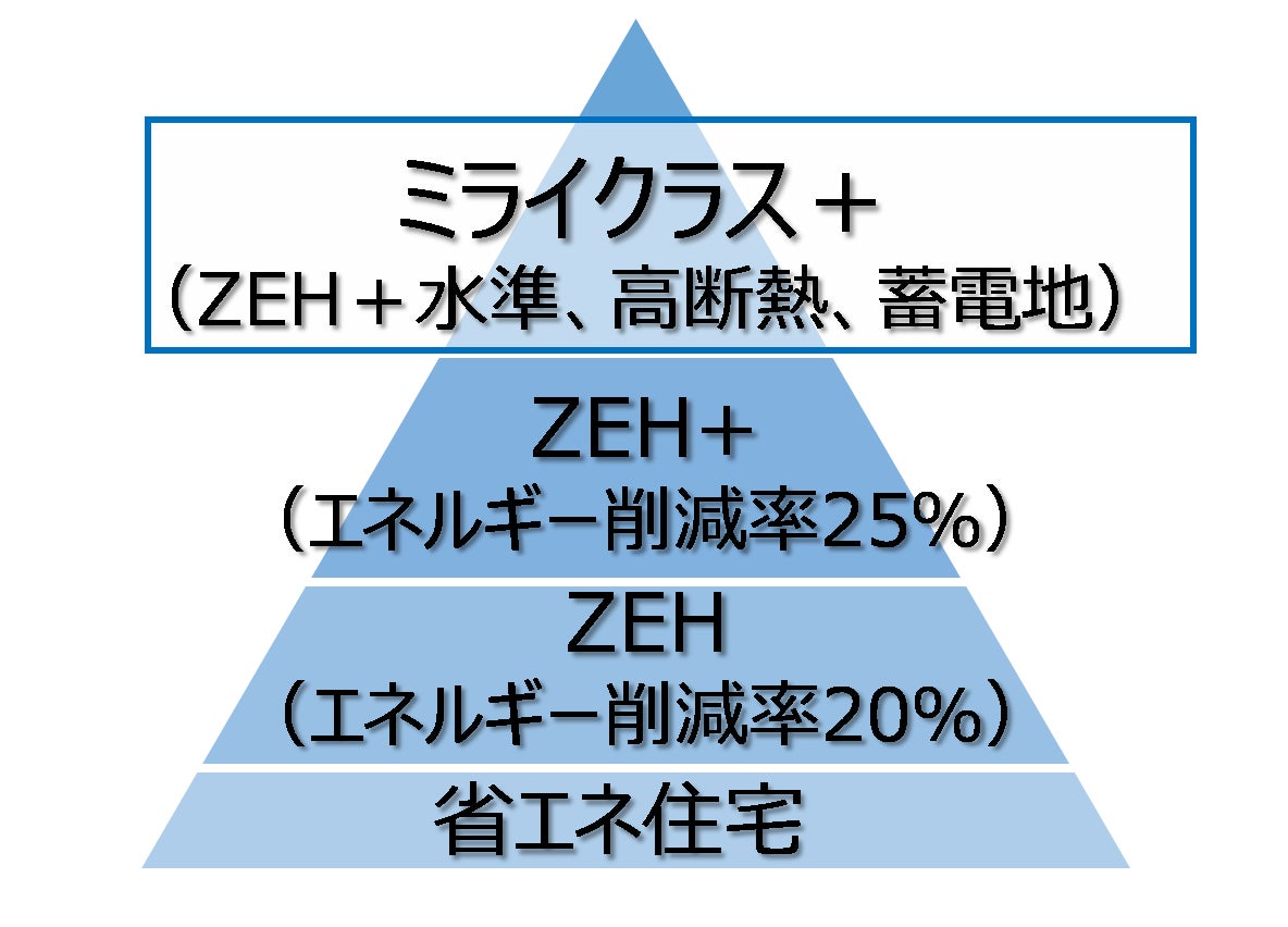 『ミライクラス+』は、再エネを除くエネルギー削減率25%、更なる高断熱、再エネの自家消費拡大などZEH+で求められる省エネ性能・仕様に標準対応しています。