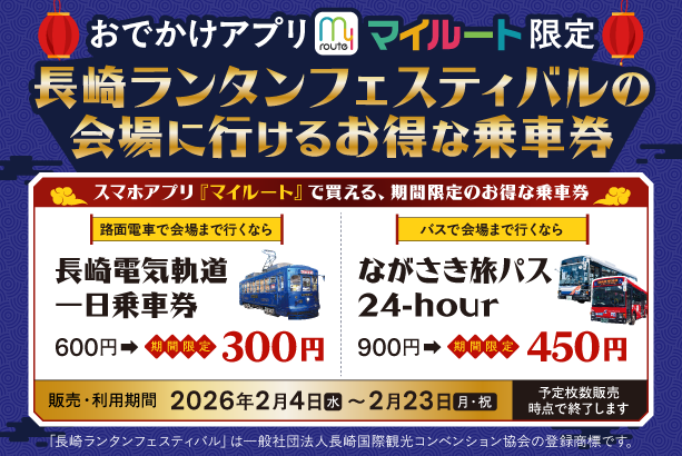 長崎ランタンフェスティバルの開催にあわせて、長崎市内の移動がお得になるデジタル乗車券割引キャンペーンがスタート!。スマートフォンアプリ「my route(マイルート)」限定の特別企画です。