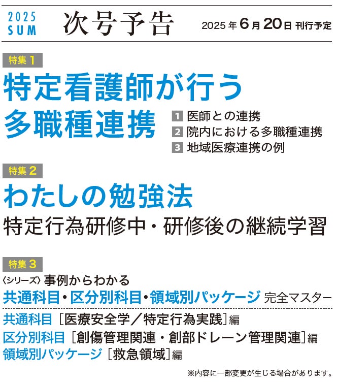 「特定行為研修修了者の実践事例が読みたい」という多くの声に応え、毎号、共通科目・区分別科目・領域別パッケージからそれぞれ1科目(領域)を取り上げ、特定行為を実践した事例について手順書とともに紹介します。特定行為研修修了者が臨床で遭遇しがちな、もしくは判断や対応などに迷う場面について、「医師からのコメント」としてその評価も掲載。実際の手順を具体的にイメージできる、実践ですぐに役立つシリーズ特集です。