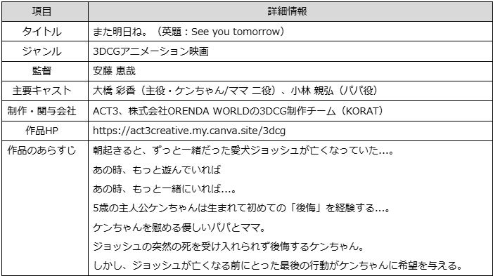 『また明日ね。』は、安藤恵哉監督(ACT3)が手がけるオリジナルシナリオによる3DCGアニメーション映画です。誰もが経験する家族の大切さについて情感豊かに描き出す映像表現と、豊かなキャラクターアニメーションが融合した作品です。