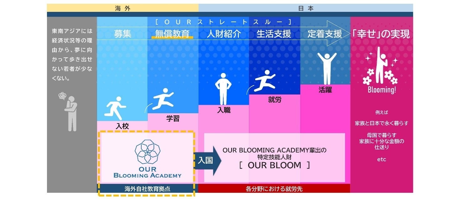 アジア各国における人財教育と、特定技能に特化した日本国内への人財紹介事業を展開※。2024年12月31日現在、累計教育人数7,718名(自社海外アカデミー在学及び終了した累計人数)、特定技能試験の合格者を6,216名輩出しております。特定技能人財の職業紹介においては5,688名が内定、4,393名(累計)がすでに紹介先で就業を開始しております。海外現地の自社教育拠点である「OUR BLOOMING ACADEMY」における日本語および特定技能教育から人材紹介、就業後の生活や資格取得の支援までをワンストップで行う独自スキーム「OURストレートスルー」により、安定して長く働ける人財をご紹介しております。