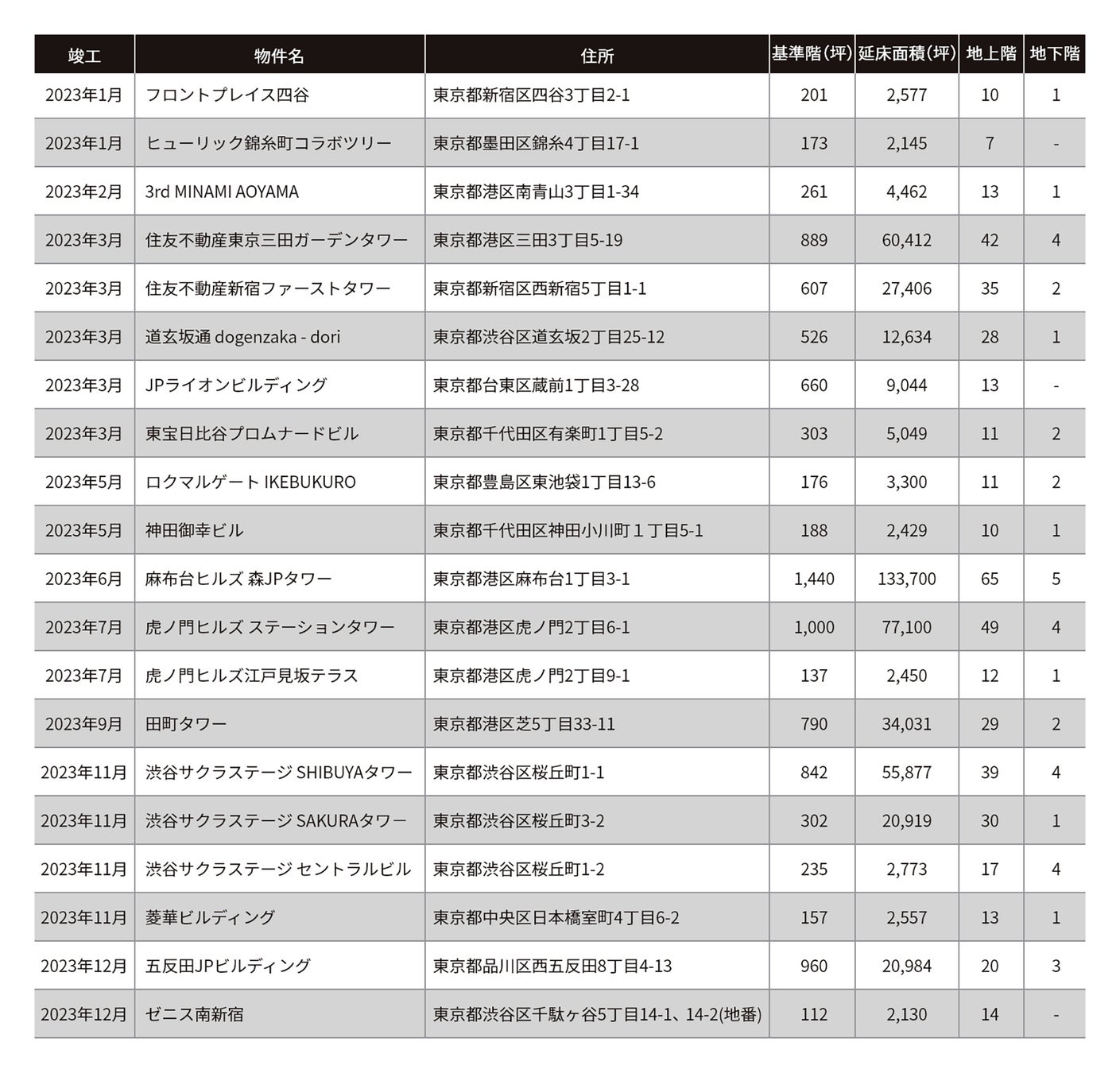 2023年に竣工した大型ビルのうち、渋谷エリアや有楽町エリアなどの一部の物件は、ほぼ満床状態で稼働している。新築ビルは、一定以上のビルスペックを当然の要件とし、空室率が低いエリアの物件については賃料水準がある程度高くとも埋まる傾向にあるといえる。