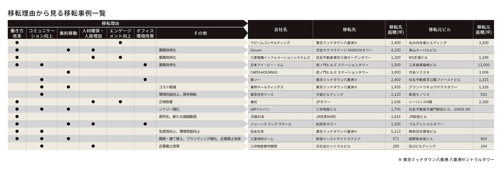 働き方改革の実現は言うまでもなく、リモートでは補うことのできないリアルなコミュニケーションや、従業員エンゲージメントの向上を目指す移転が増えているほか、働く環境が重要視されるようになった中での人材確保を目的とした移転がトレンドになっている。