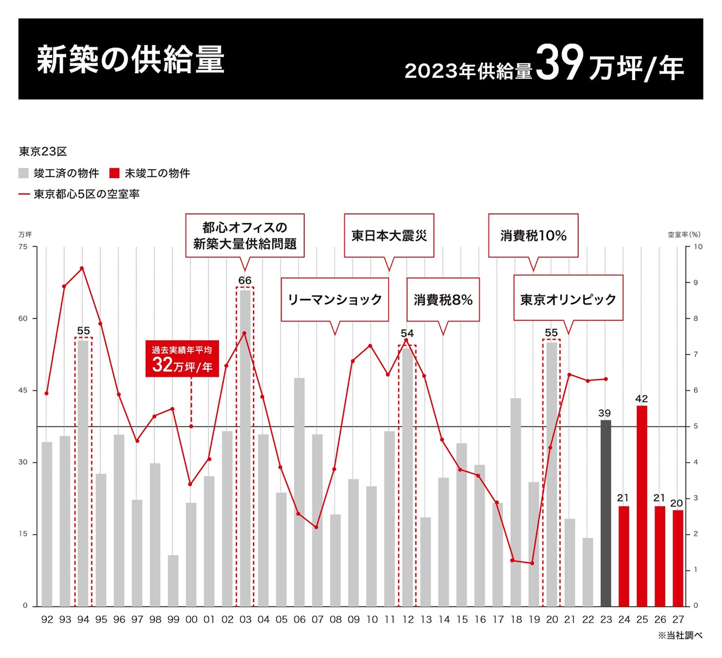 2023年の東京主要5区オフィスビル新規供給量は約39万坪と、3年ぶりに過去平均を上回る数字となった。2023年の大量供給によって空室率が悪化する懸念もあったが、昨年とほぼ同じ水準を維持した。マーケットは回復傾向にあり、新規の供給を上回る需要があったといえる。