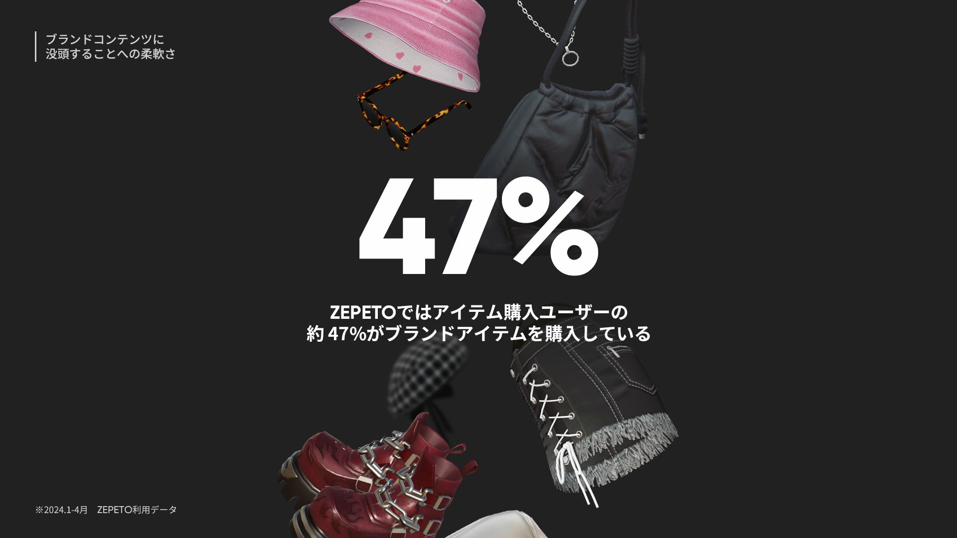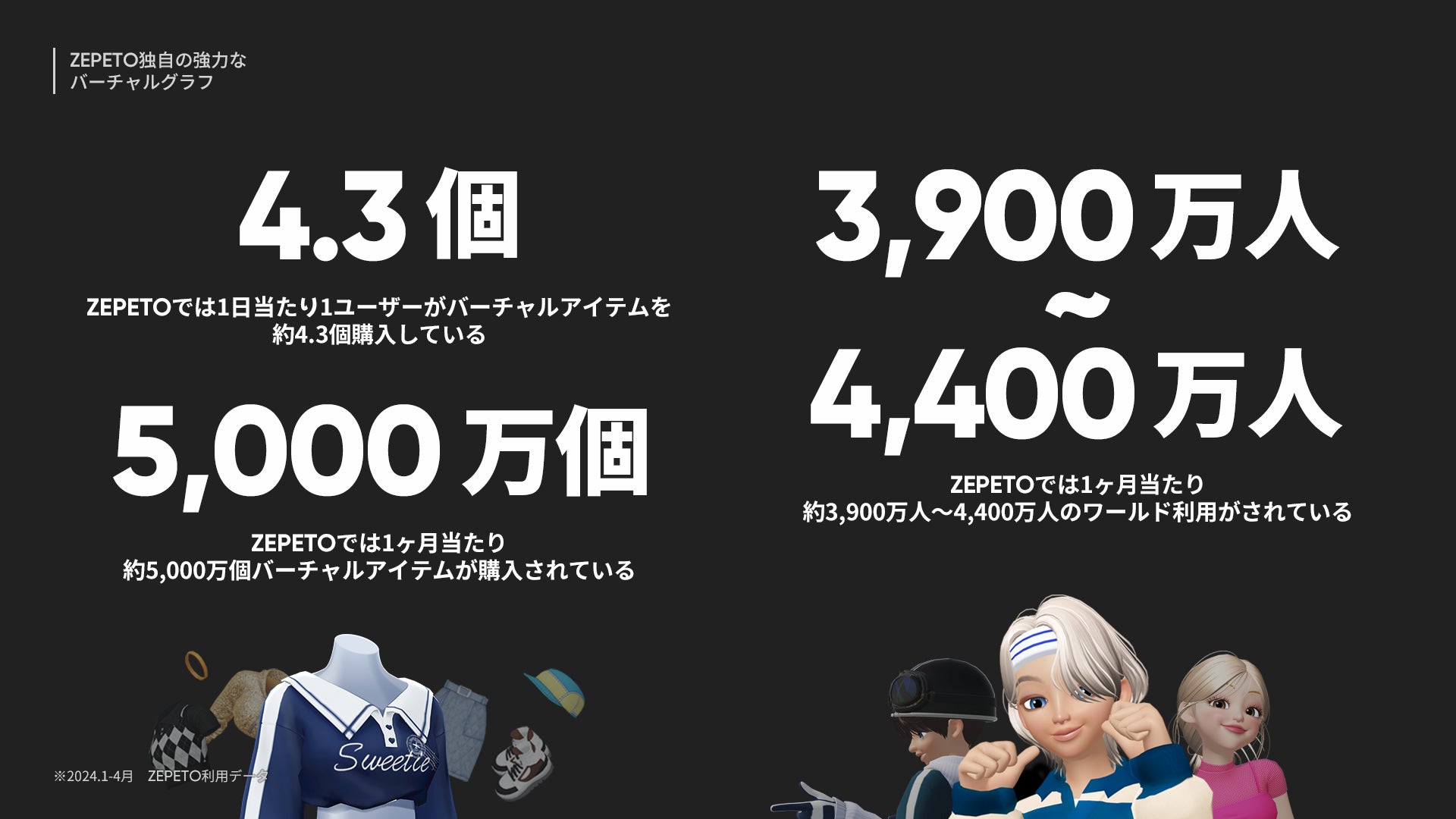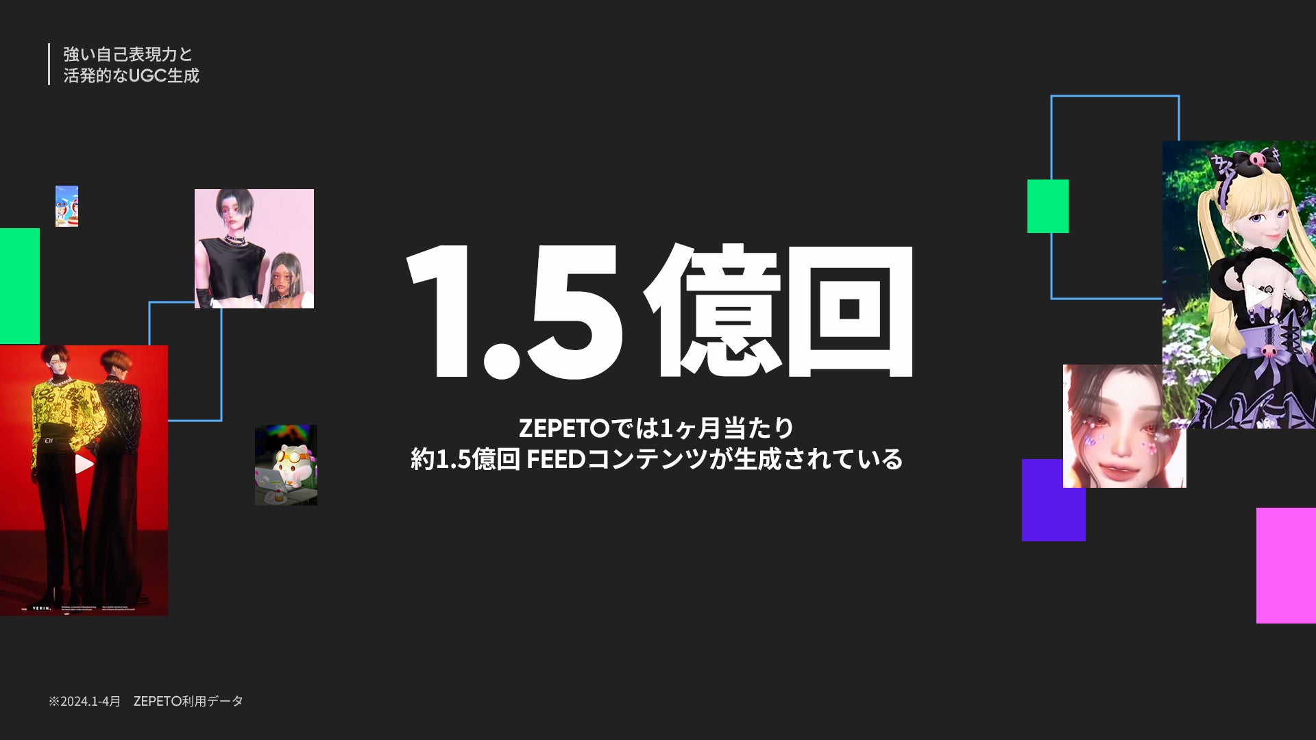 ZEPETOはバーチャル上のあらゆる自己表現を実現するコミュニケーションプラットフォームです。世界で人気のIP、ブランド、セレブリティやZEPETOクリエイターのコンテンツを用い、非常に活発なUGCが生まれており、ビジネスにインパクトを与えています。