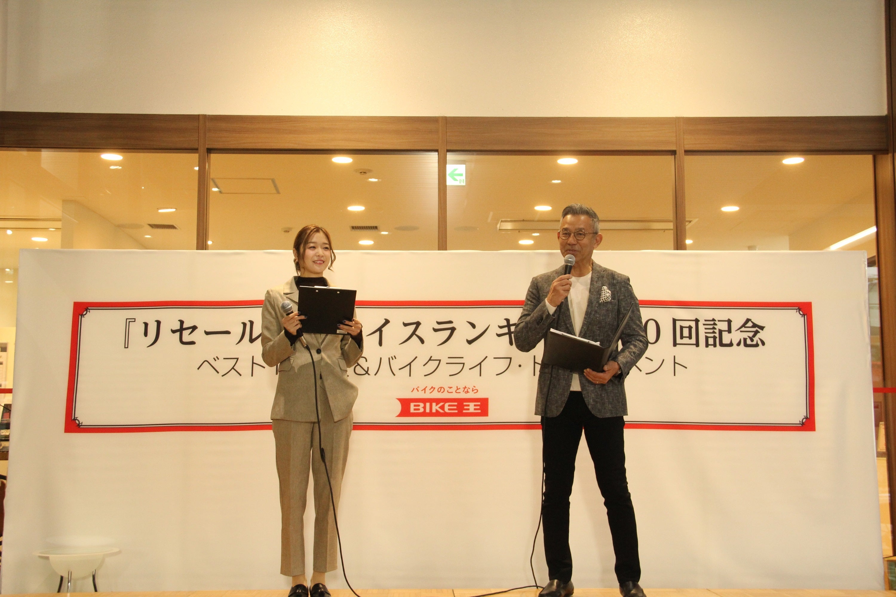 バイク未来総研所長の宮城光さんとバイク王公式アンバサダーの朝山すずさんがイベントのMCとして登壇し、「リセール・プライスランキング」第50回目のランキング結果を発表しました。