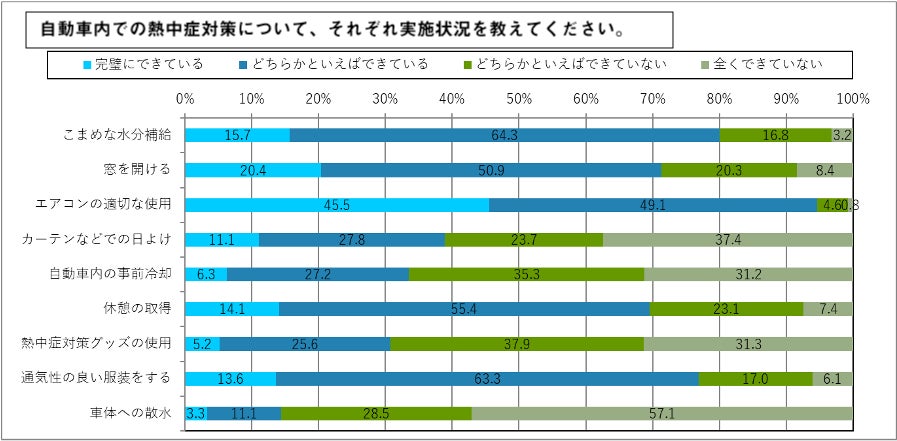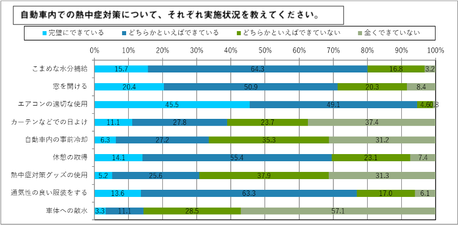 特に車体の温度を下げるのに効果的な車体への散水については、85.6%の方が「どちらかといえばできていない」「全くできていない」と回答する結果となりました。