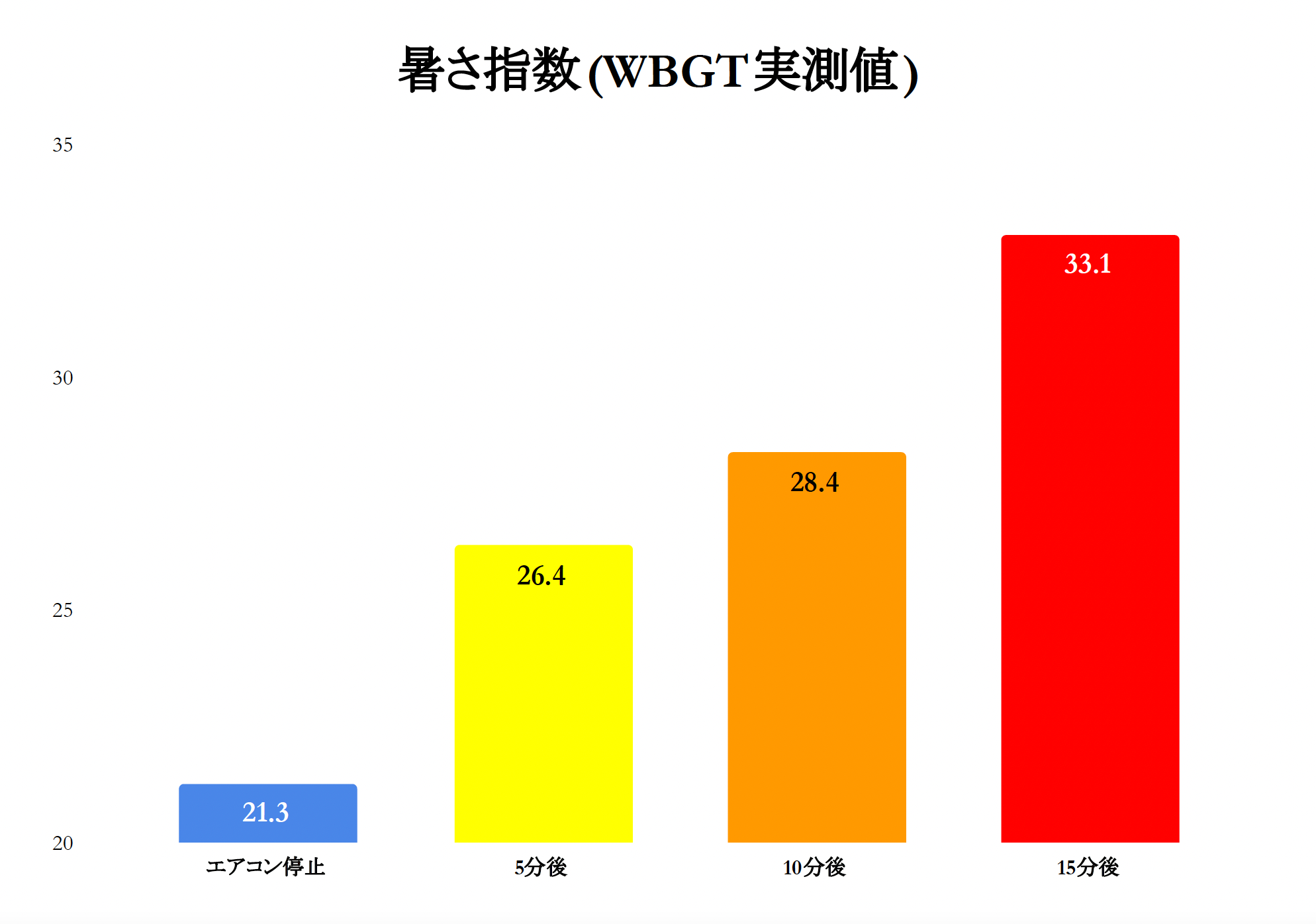 ● テスト:午後12時半からエアコン温度18度で設定した車内のエアコンを切り15分間のWBGT(湿球黒球温度) を計測。