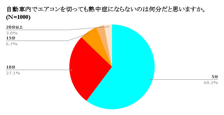 自動車を日常的に運転する20~60代の男女1000人に「自動車内でエアコンを切っても熱中症にならない時間が何分以内か」を訪ねた所、39.8%の方がエアコン停止後に熱中症警戒レベルに到達する10分以上を選択していました。このことにより、半数近い方がリスクが高まる時間について知らなかったことが判明。