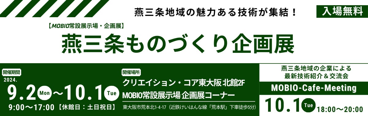 9月2日(月)~10月1日(火)、燕三条地域のものづくり企業8社と燕三条地場産業振興センターがMOBIOに出展!バレル研磨といった技術やパイプ・板金の溶接製品等の展示イベントを開催します。